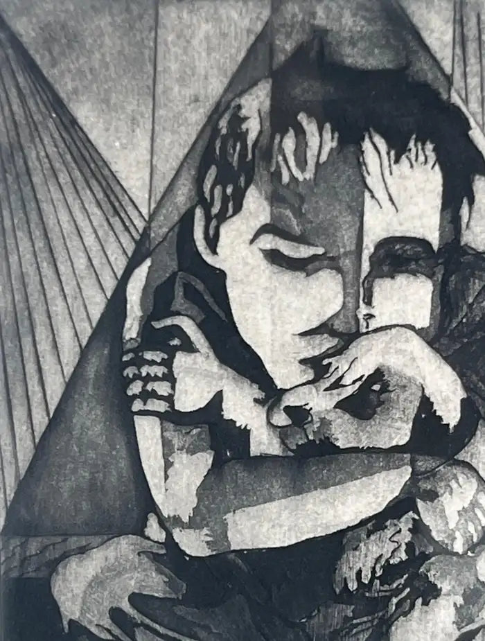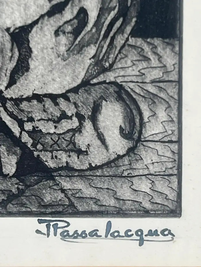 This striking black-and-white print by Joseph Passalacqua, titled Companions, demonstrates the artist’s command of intaglio techniques and his sensitivity to the expressive potential of the human form. Executed in etching with aquatint, the work presents two closely intertwined figures rendered in bold contrasts of light and shadow. The angular planes, faceted forms, and layered tonalities suggest affinities with Cubism and Expressionism, while the composition conveys a profound sense of intimacy and solidarity. The figures, seated with arms encircling one another, emerge from a geometric backdrop that heightens the tension between abstraction and figuration. Passalacqua’s use of etched line combined with aquatint textures creates a dramatic chiaroscuro effect, giving the work both structural strength and emotional resonance. Companions captures the spirit of mid-20th-century modernist printmaking, balancing innovation in form with timeless themes of human connection. The print reflects the artist’s ability to transform technical mastery into deeply felt visual poetry.