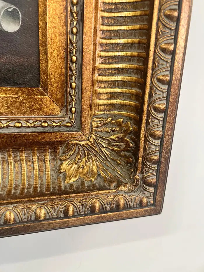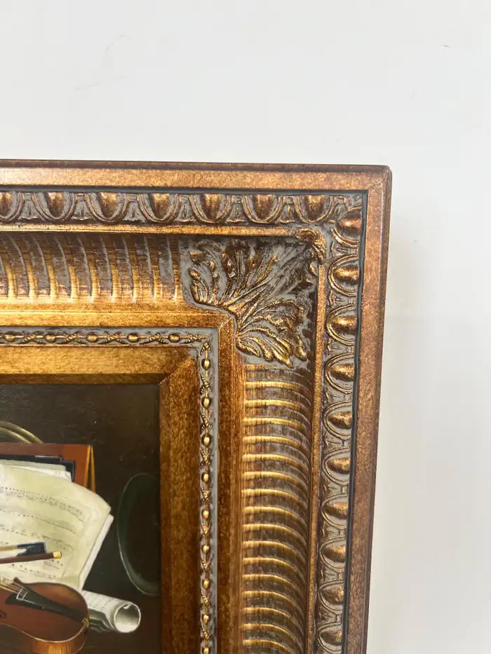 Still Life Violin & Sheet Music Oil on Canvas Signed Hessler, Framed : A finely rendered trompe-l’Œil still life attributed to Otto Rudolf Hessler ( German 1856- 1942) depicting a violin resting across an open book of sheet music, accompanied by a leather-bound volume, a rolled manuscript, and additional papers arranged upon a dark tabletop. Executed with remarkable attention to detail, the composition captures the textures of polished wood, aged paper, and gilt bindings with striking realism. This work reflects the academic realist tradition of late 19th- and early 20th-century Germany, where Hessler is known to have produced similarly meticulous still lifes. The dramatic contrast of the illuminated objects against the shadowed background enhances the sense of depth, while the subject matter—musical instruments and books—conveys both cultural refinement and the quiet poetry of study. Oil on canvas, signed “Hessler” lower right. Attributed to Otto Rudolf Hessler (1856–1942). Presented in an ornate period-style giltwood frame.