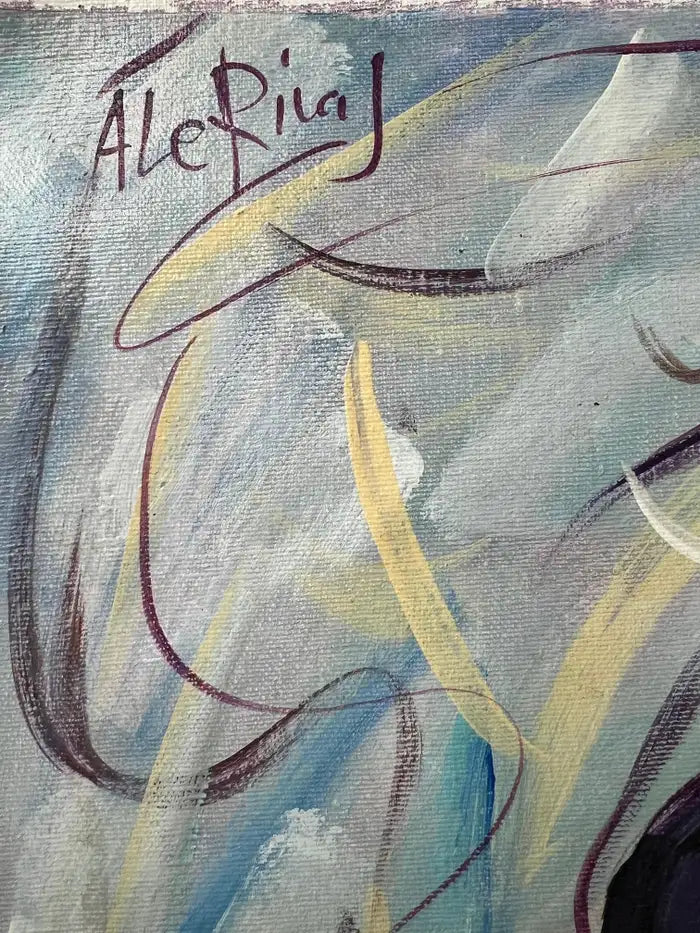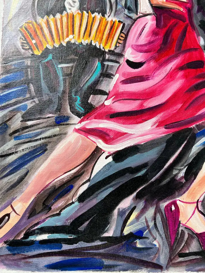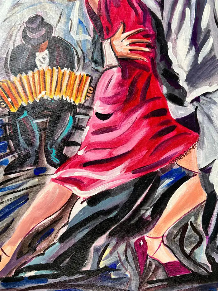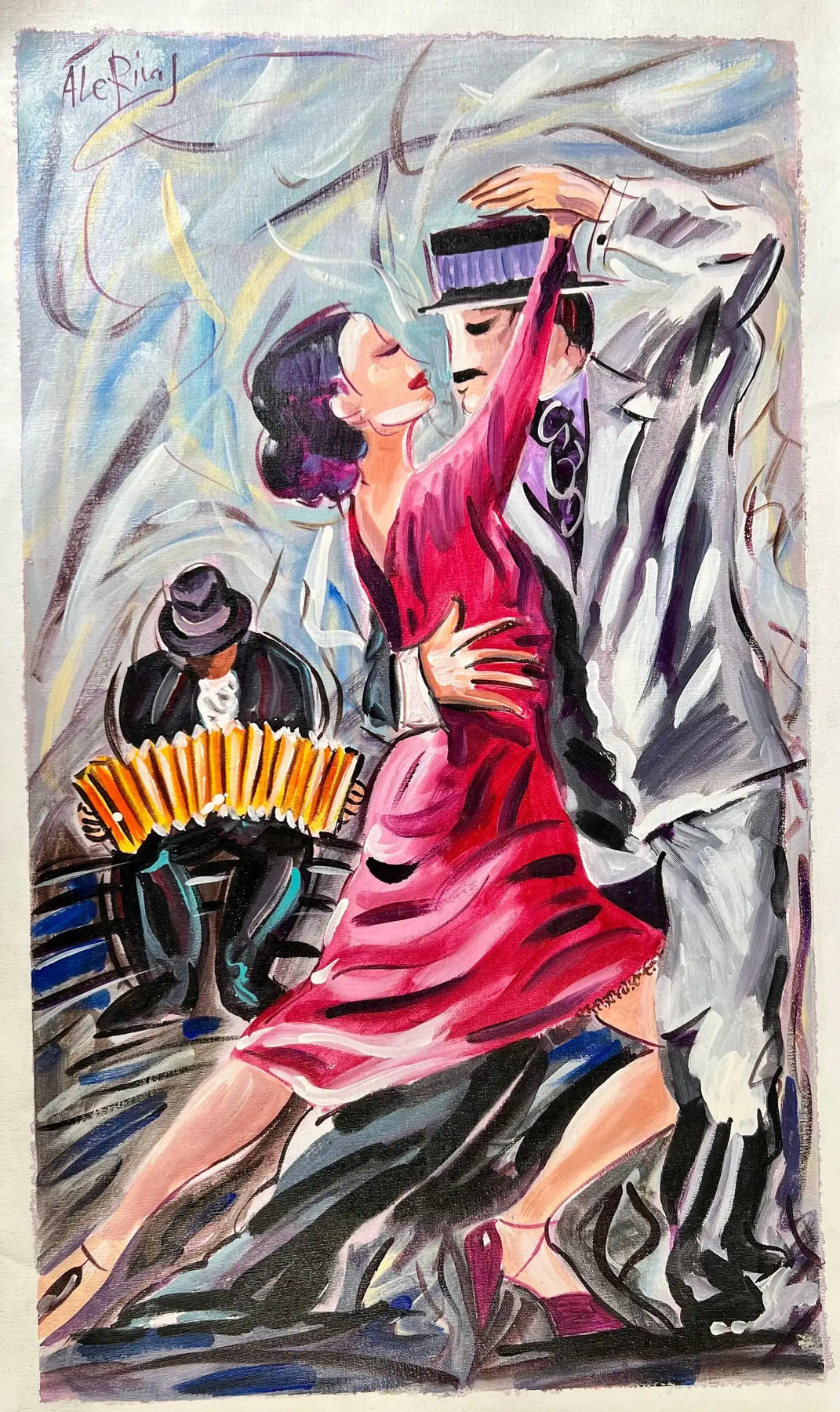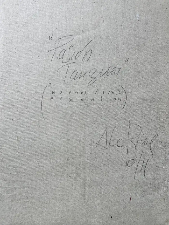 Pasión Tanguera Oil on Canvas Painting by Ale Riva (Buenos Aires, Argentina - b. Unknown ) This evocative oil on canvas captures the raw intensity and romance of Argentine tango, set against the atmospheric spirit of Buenos Aires. In a dramatic embrace, a tango couple moves in perfect synchronicity—her flowing crimson dress and elongated stride conveying passion and abandon, while his tailored suit and poised gesture suggest strength, control, and intimacy. Their movement is fluid and expressive, rendered with sweeping brushstrokes that heighten the sense of rhythm and motion. Behind them, a seated musician plays the bandoneón, anchoring the composition in the authentic soundscape of tango culture. The palette—dominated by smoky grays, deep blacks, and vibrant reds—creates a moody, nocturnal ambiance, echoing the emotional depth of the dance itself. Loose, gestural lines and painterly abstraction give the work a contemporary expressionist character while remaining firmly rooted in figurative tradition. The painting is signed by the artist Ale Rival on the front and further authenticated on the verso, where it is hand-titled “Pasión Tanguera,” inscribed with “Buenos Aires, Argentina,” dated 10/11 ( 10/2011) and signed by Ale Rival. These handwritten details on the back provide strong provenance and confirm the artist’s direct connection to the subject matter and place of inspiration. The artwork is not framed or stretched .