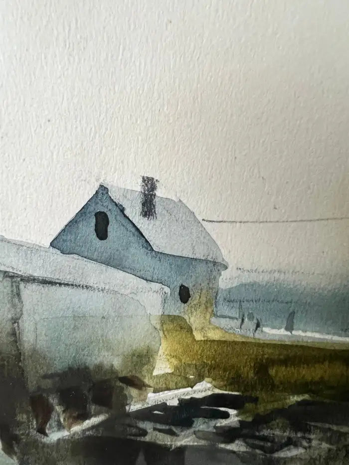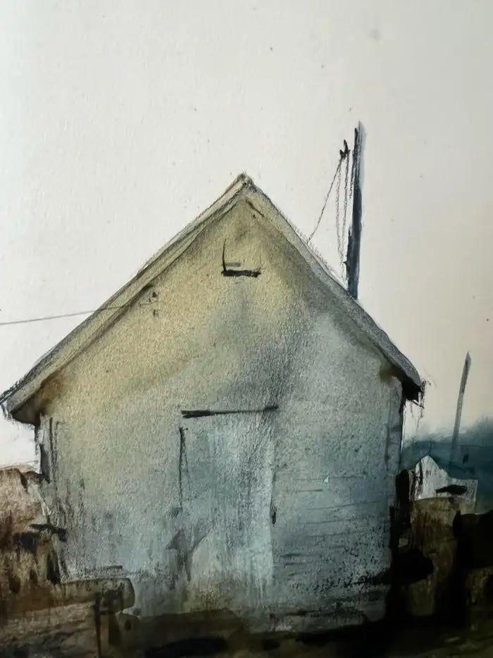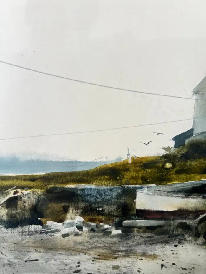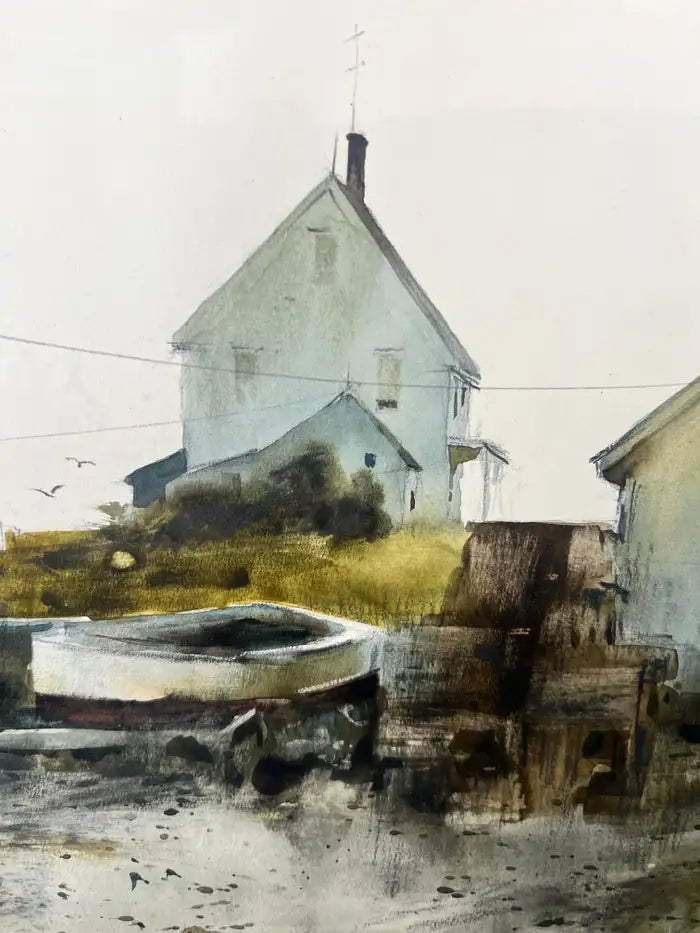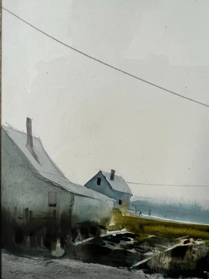Philip Jamison (American, 1925–2021) Untitled Coastal Scene (signed lower left) Watercolor on paper This evocative watercolor by Philip Jamison captures the quiet poetry of the American coastline through his masterful handling of light and atmosphere. With a muted palette of soft grays, earthy browns, and cool blues, the scene depicts a rustic cluster of seaside buildings, their weathered forms standing in gentle harmony with the surrounding landscape. A single boat rests in the foreground, its stillness underscoring the contemplative mood, while delicate washes and fluid brushwork suggest the hazy presence of sea air. Jamison’s ability to balance detail with abstraction is evident here — the structures are rendered with architectural clarity, yet the softened edges and tonal variations imbue the work with a dreamlike quality. The composition reflects the artist’s lifelong devotion to watercolor as a medium of immediacy and subtlety, as well as his deep sensitivity to the enduring character of New England’s coastal villages. Signed in the lower left, this work exemplifies Jamison’s reputation as one of the foremost American watercolorists of the 20th century, blending technical mastery with a profound sense of place and atmosphere.