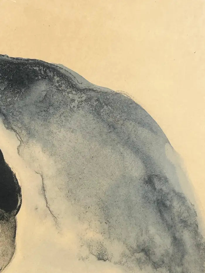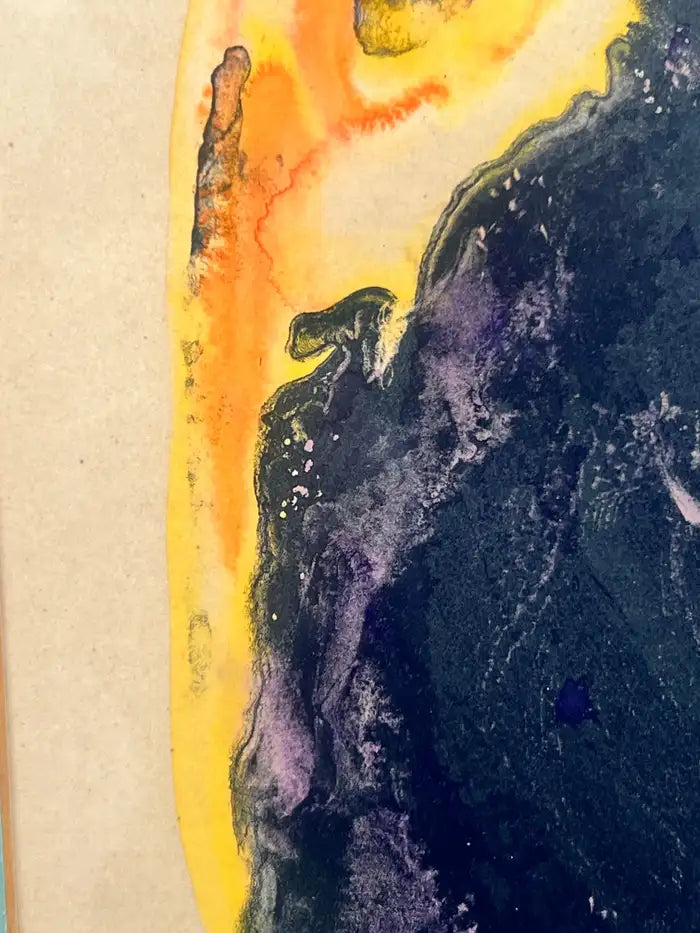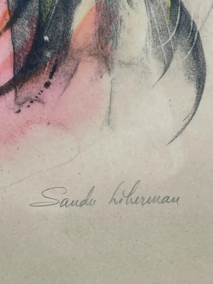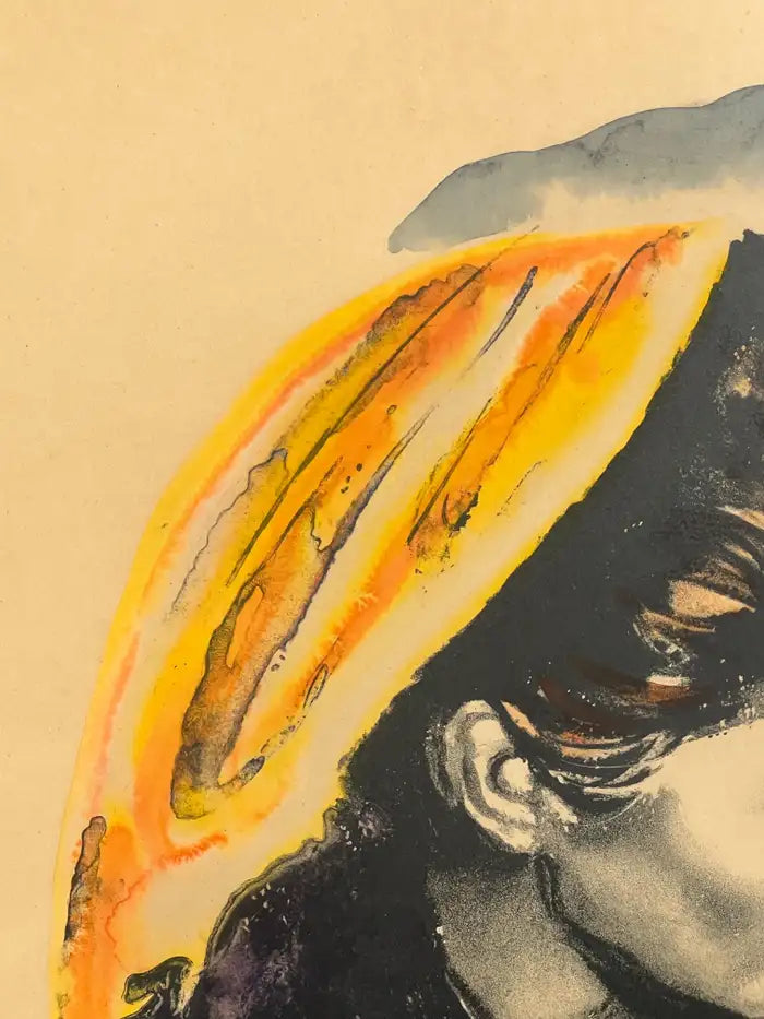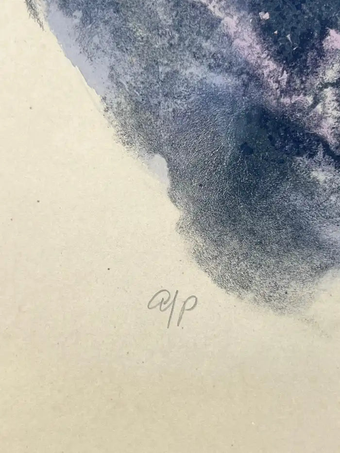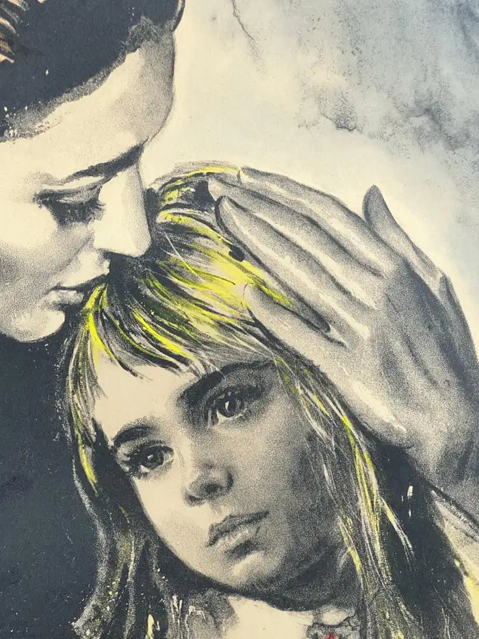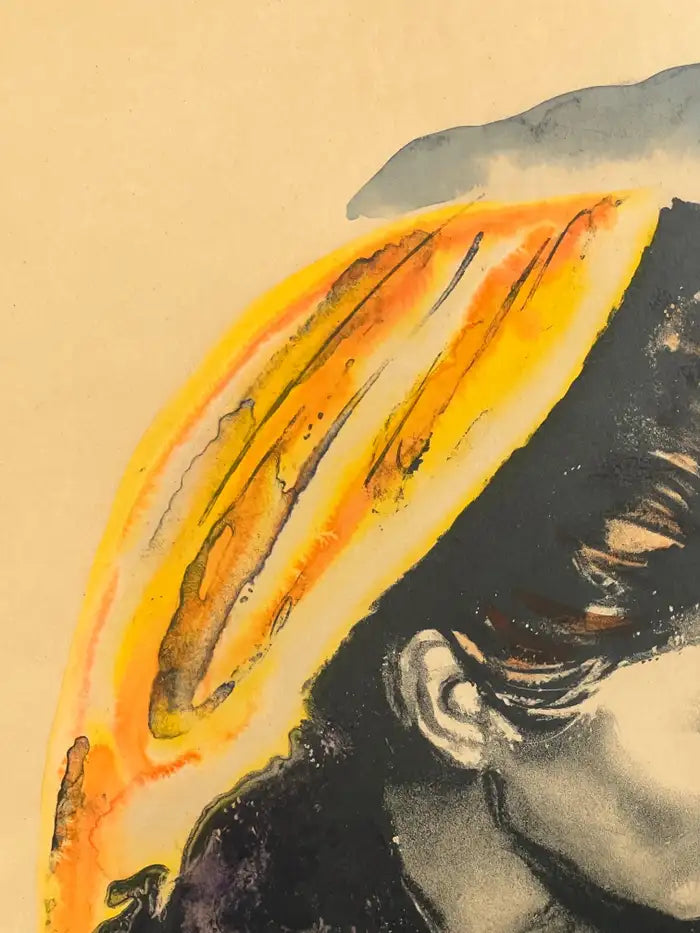 Sandu Liberman titled (Mother and Child) Hand-signed Artist’s Proof Lithograph: This poignant lithograph by renowned artist Sandu Liberman (Romanian–Israeli, 1923–1977) captures the timeless bond of maternal love with sensitivity and grace. The composition presents a mother gently inclining her head to kiss her child, her hand tenderly resting as if to shield and protect. The child, rendered with wide, contemplative eyes, leans into the embrace, embodying both innocence and trust. Executed with Liberman’s distinctive painterly lithographic technique, the work balances expressive lines with washes of color—warm ochres and reds that highlight the figures against a soft, moody background of greys and blacks. The interplay of vibrant accents and muted tones underscores the emotional intensity of the scene while imbuing it with a universal and enduring quality. This piece is an Artist’s Proof (A/P), making it particularly desirable among collectors for its rarity. It is hand-signed in pencil by the artist on the lower right, further affirming its authenticity. Elegantly presented in a gilt, textured frame with a cream mat, the lithograph is both a moving work of art and a collectible example of Liberman’s celebrated oeuvre, where human intimacy and emotional resonance are at the forefront.