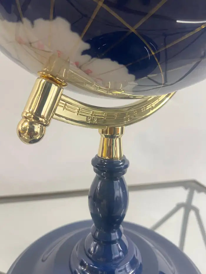 This striking decorative world globe features a richly saturated lapis-blue surface inlaid with detailed continental cartography, accented by warm earth tones and fine grid lines. The globe is elegantly mounted within a polished gilt metal meridian arm, adding a classic, old-world sophistication. It rests on a turned pedestal base finished in a deep blue lacquer, creating a harmonious contrast between the luminous gold detailing and the glossy cobalt tones. Both sculptural and scholarly in presence, this globe evokes the timeless elegance of grand libraries, executive offices, and refined interiors. Perfect as a statement object for a desk, console, or bookcase, it bridges traditional craftsmanship with decorative luxury—ideal for collectors, travelers at heart, or design enthusiasts seeking an intellectual yet ornamental accent.
