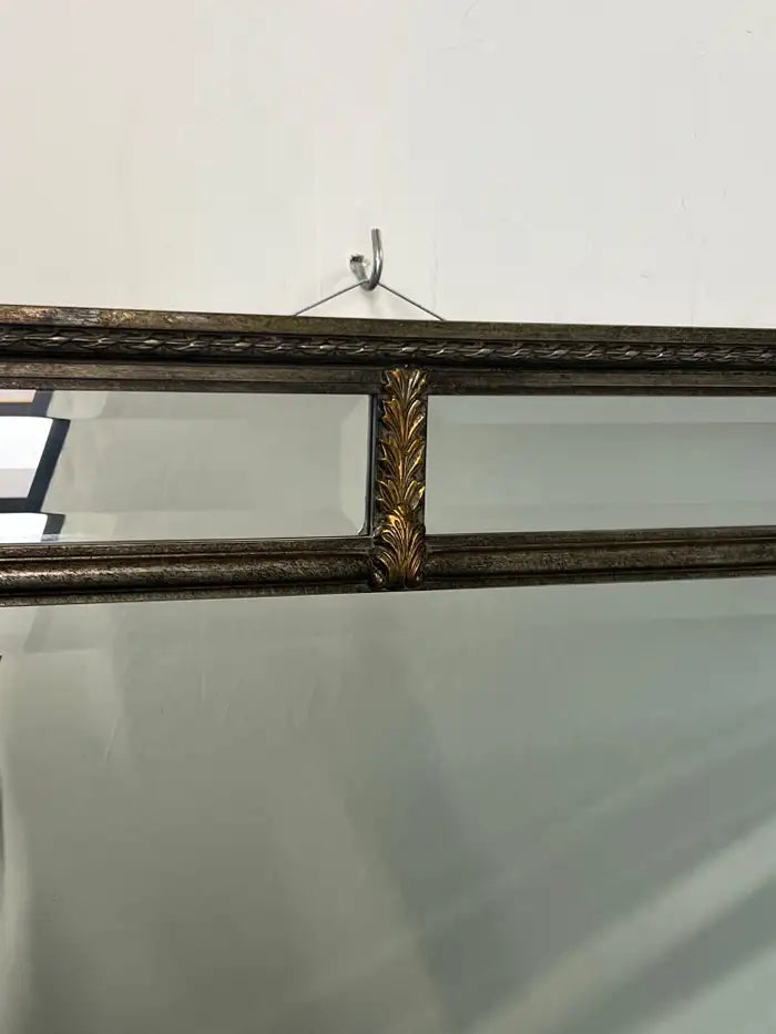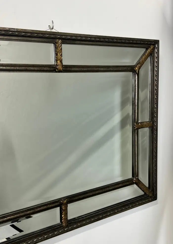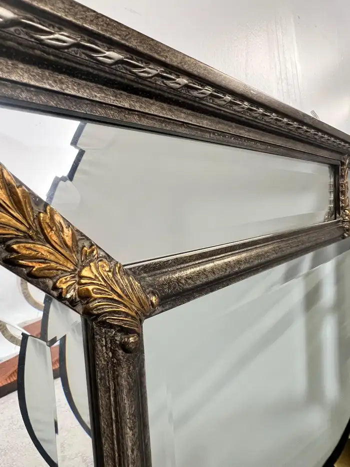 Hollywood Regency Style Beveled Multi-Panel Mirror with Rope & Gilt Leaf Design A striking large-scale wall mirror in the Hollywood Regency style, featuring a sophisticated segmented design with multiple beveled mirror panels. The frame is adorned with a classic rope motif, rendered in a beautifully aged metallic finish, and accented at each intersection with gilt acanthus leaf embellishments that add a touch of neoclassical flair. The angular mirrored inserts and decorative details reflect light dramatically, creating an elegant focal point ideal for a grand entryway, living room, or dressing space. Timeless and glamorous, this mirror embodies the luxurious charm of mid-20th-century design.