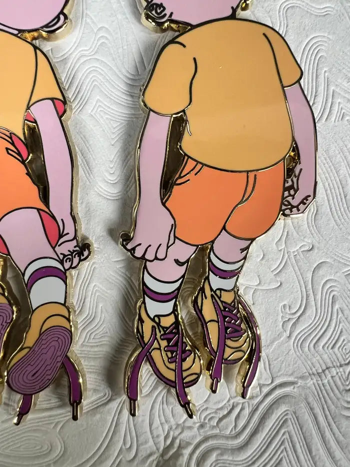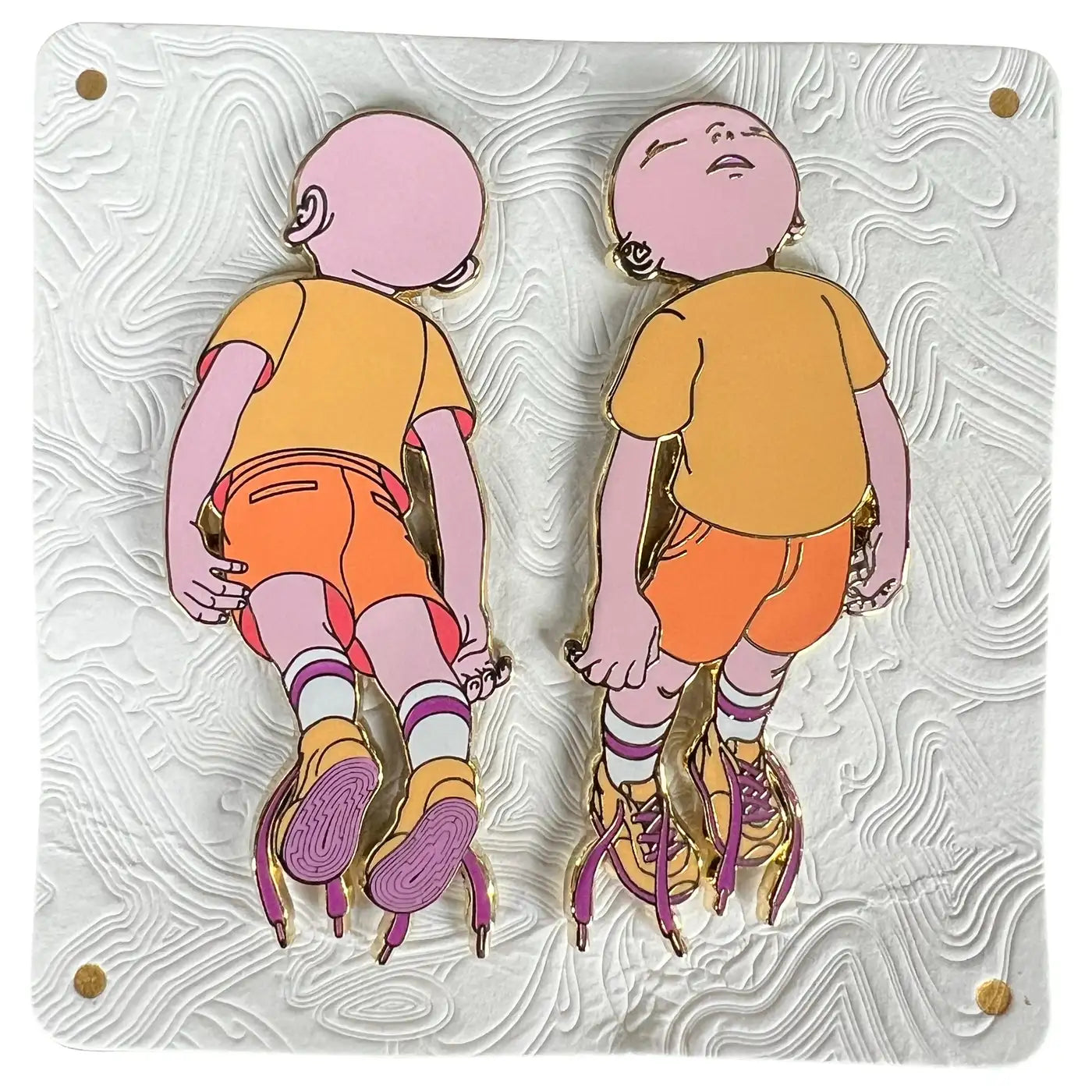 Descendants captures James Jean ( American - Taiwanese b.1979) signature blend of surrealism and emotional depth. This limited edition enamel pin set features two ethereal childlike figures, rendered in vibrant hues of melon, tangerine, and rose, with limbs relaxed in surrender and roots unfurling from their shoes—suggesting both grounding and transformation. The pins are delicately outlined in gleaming gold, set against a textured backdrop that enhances their dreamlike presence. At once nostalgic and otherworldly, Descendants evokes themes of memory, vulnerability, and the quiet resilience passed through generations.