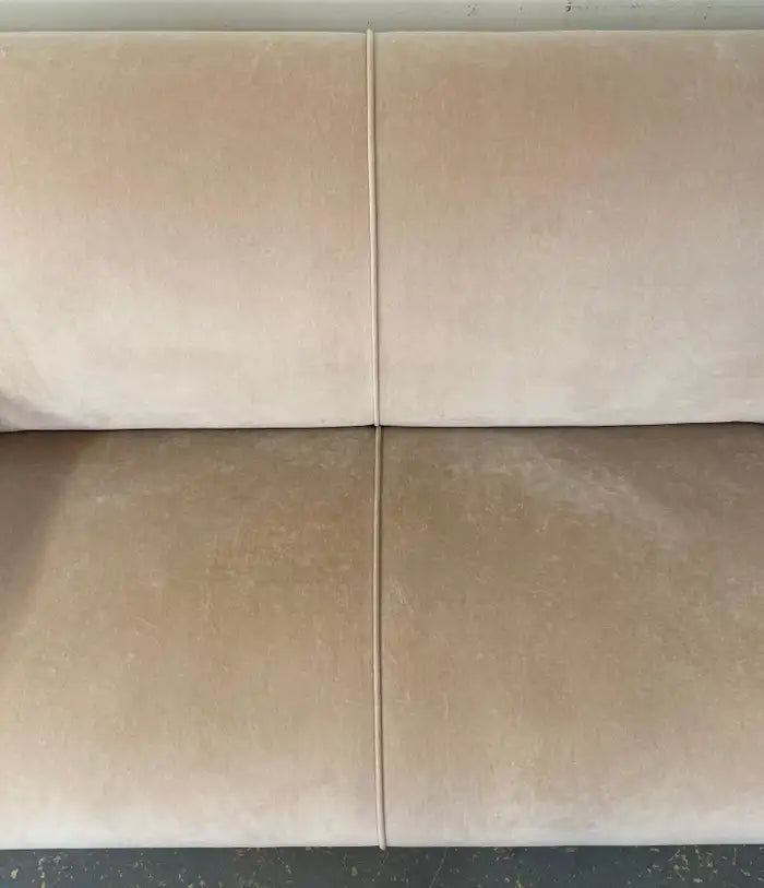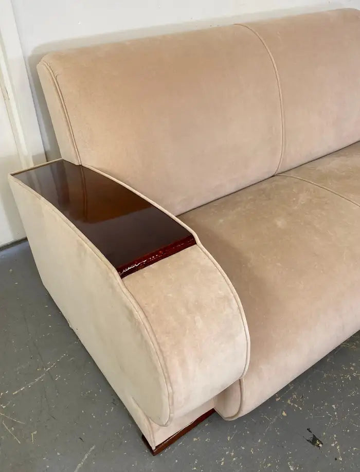 This French Art Deco sofa or settee represents an exquisite manifestation of the Art Deco movement's predilection for harmonious curves and sensuous forms. The rosewood armrests, adding opulence and exotic allure, elevate this sofa to the echelons of timeless sophistication. These meticulously crafted armrests, while undeniably functional, serve as sculptural accents that confer an aura of regal distinction upon this piece. The velvet upholstery in beige / light pink , speaks volumes of quality and discernment. Its tactile plushness and subdued elegance beckon one to recline upon the sofa, promising the utmost in comfort. The Art Deco sofa is a testament to the era's unwavering commitment to marrying aesthetics and functionality with unwavering finesse.