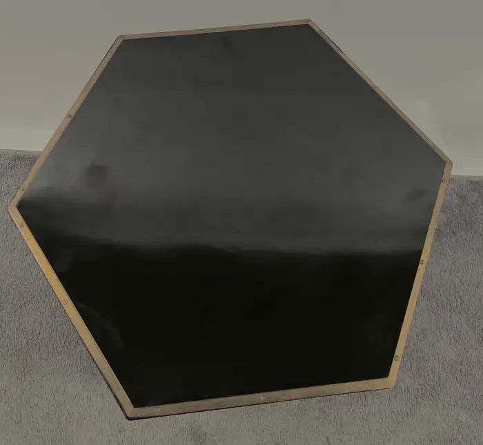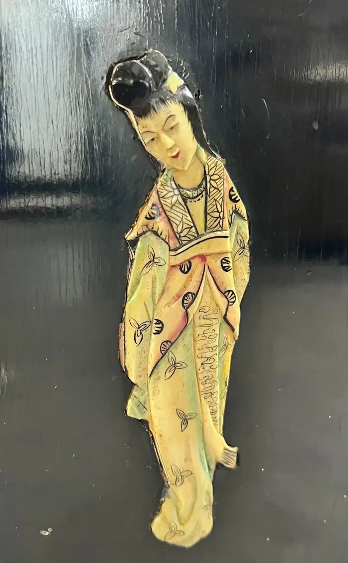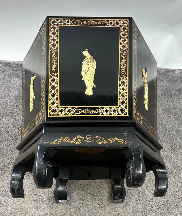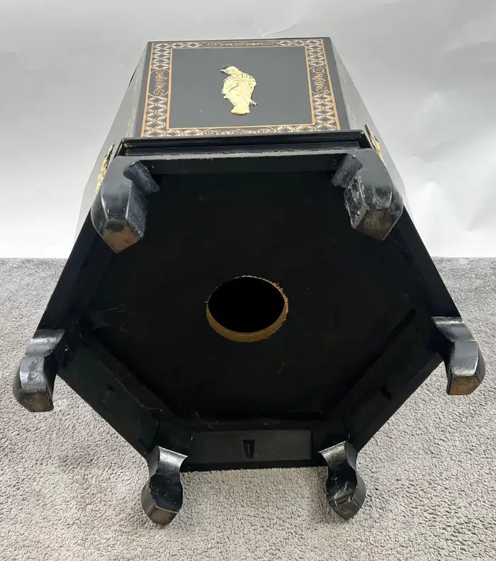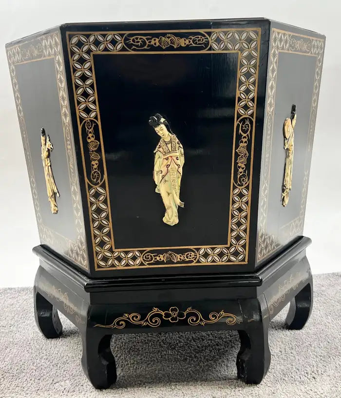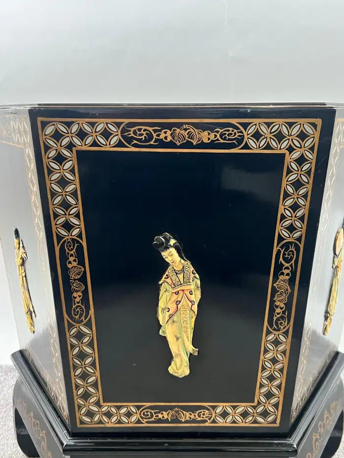 A striking Asian black lacquer hexagonal side table featuring hand-painted gold and white decorative borders framing sculptural figural panels on each side. The deep lacquered ground provides dramatic contrast to the intricate geometric and scroll motifs, executed in warm gold tones with delicate light accents. Each panel is centered with a raised traditional figure, adding depth and dimension to the piece. The table rests on a shaped pedestal base with curved feet and coordinating painted ornamentation, enhancing its architectural presence. The combination of glossy black lacquer and detailed hand-painted embellishment evokes classic chinoiserie influences, making this piece ideal for Hollywood Regency, traditional, or eclectic interiors. A sophisticated accent table that functions beautifully as a side table, pedestal, or decorative focal point.