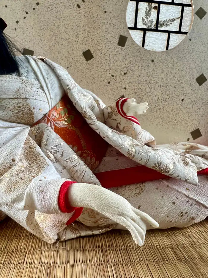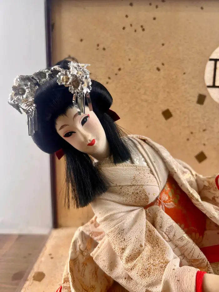 This exquisite antique Japanese Geisha doll is a beautifully preserved example of traditional craftsmanship, elegantly presented in its original glass display case. The doll is depicted in a graceful reclining pose on a woven tatami mat, dressed in an opulent ivory kimono with intricate embroidery and delicate red silk accents. Her serene porcelain face is framed by a classic coiffure adorned with silver hair ornaments, evoking the elegance of a high-ranking Geisha or courtly princess. The backdrop features a subtly textured panel with a stylized moon window design, adding a poetic ambiance reminiscent of classical Japanese interiors. A small, upholstered stool in traditional textile adds charm and detail to the vignette. The entire scene is enclosed in a wooden case with glass panels and a silk tassel accent, preserving the doll in museum-like condition. A rare and captivating collector’s piece, this display embodies the refinement and cultural richness of Japan’s artistic heritage.