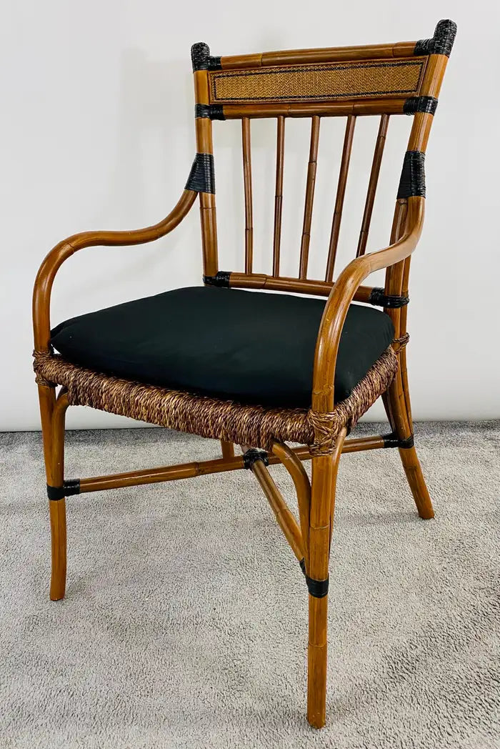 A quality Mid Century Boho Chic faux bamboo and Rattan armchair. Finely carved , the chair features curved arms resting on a rattan seat. The back of the chair is slightly curved providing additional comfort and embellished with rattan and black stitching design. The chair is raised on four slender legs, connected to one another with an X-form cross stretcher. This timeless and high quality chair will add style and class to any space or design. The chair comes with custom made black seat cushion.