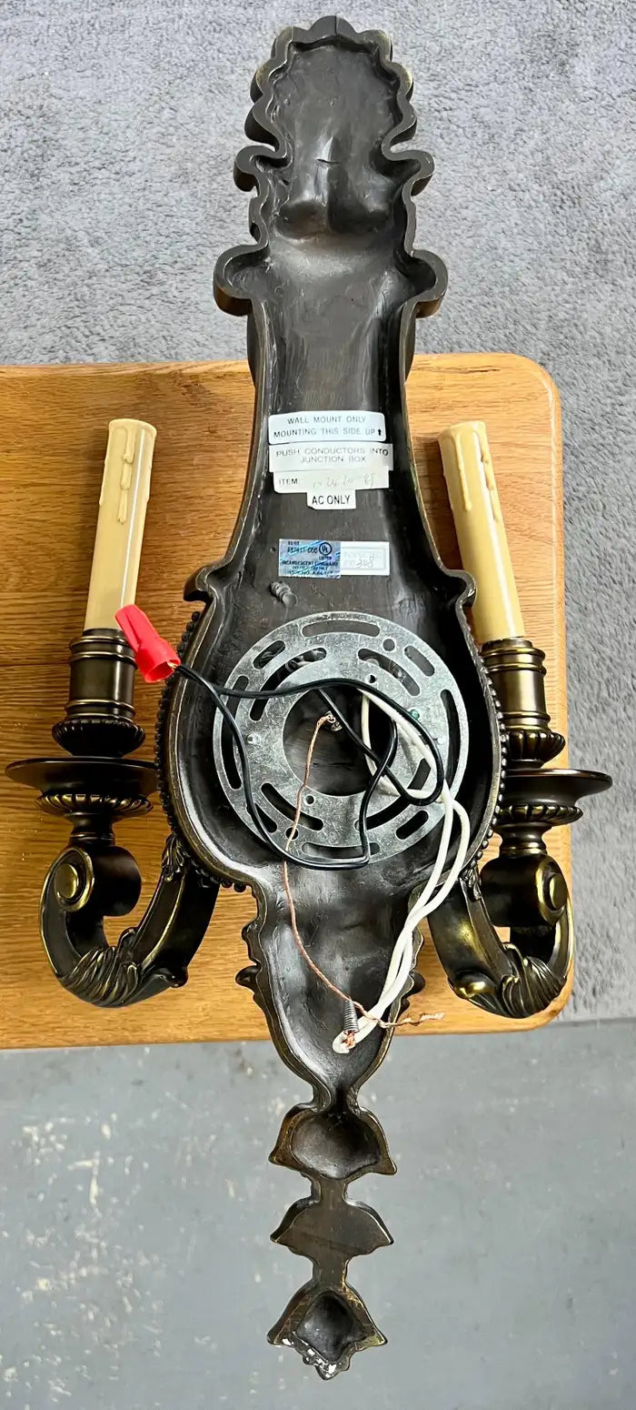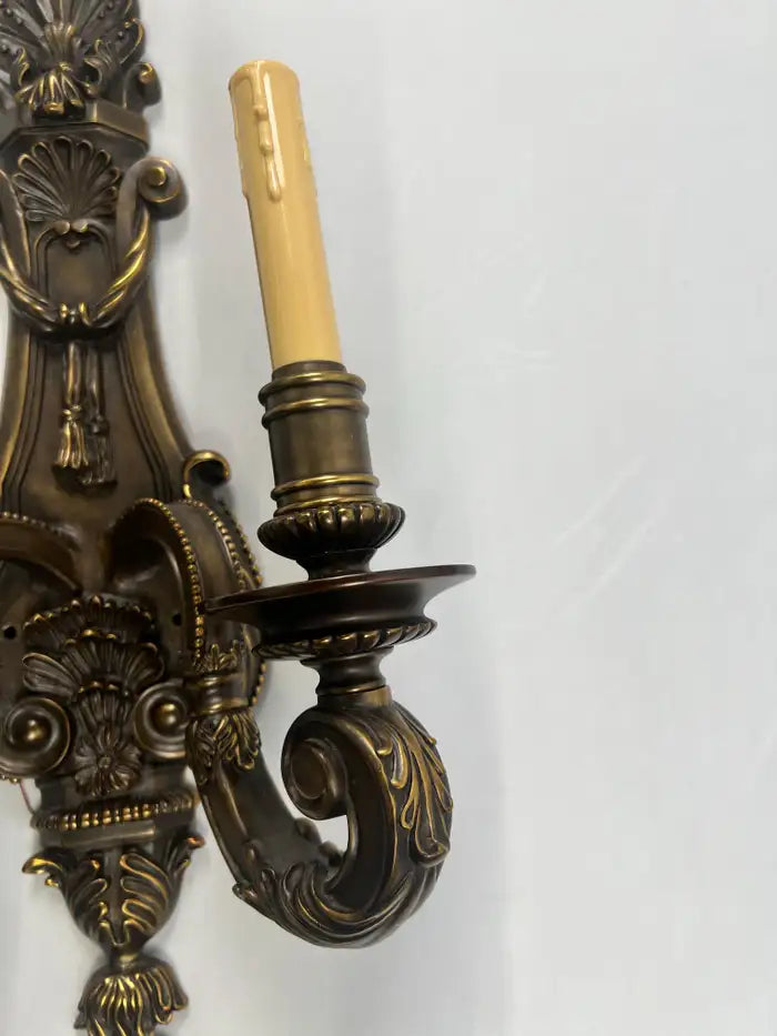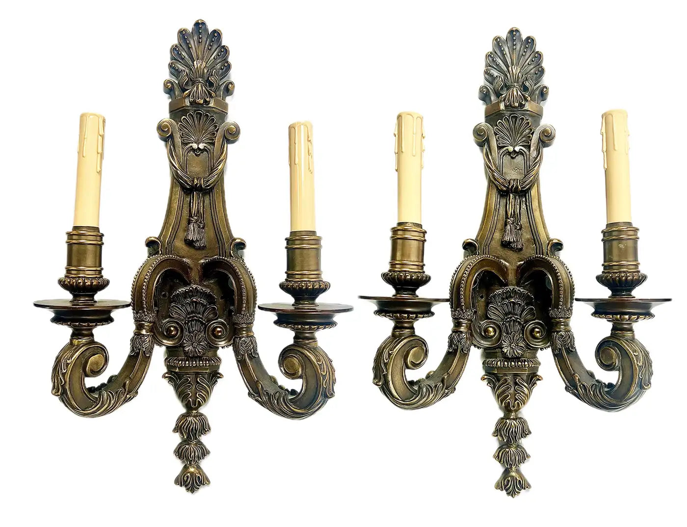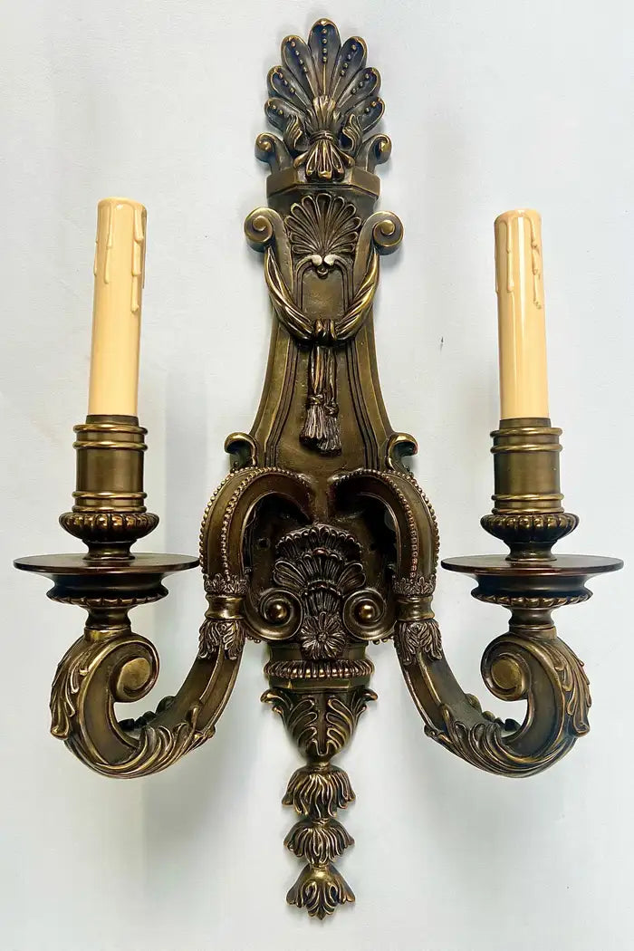 A distinguished pair of French Louis XVI Revival wall sconces, expertly cast in patinated bronze and richly adorned with classical motifs. Each sconce features two elegantly scrolled arms terminating in candle-style lights with faux wax sleeves, echoing the timeless charm of 18th-century French lighting. The backplate is finely detailed with acanthus leaves, beaded accents, and a prominent ram’s head motif—a neoclassical symbol of strength and refinement. The warm, aged patina enhances the sculptural depth and antique character of each piece.