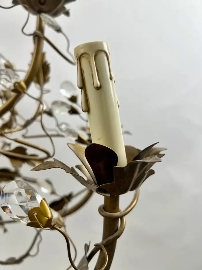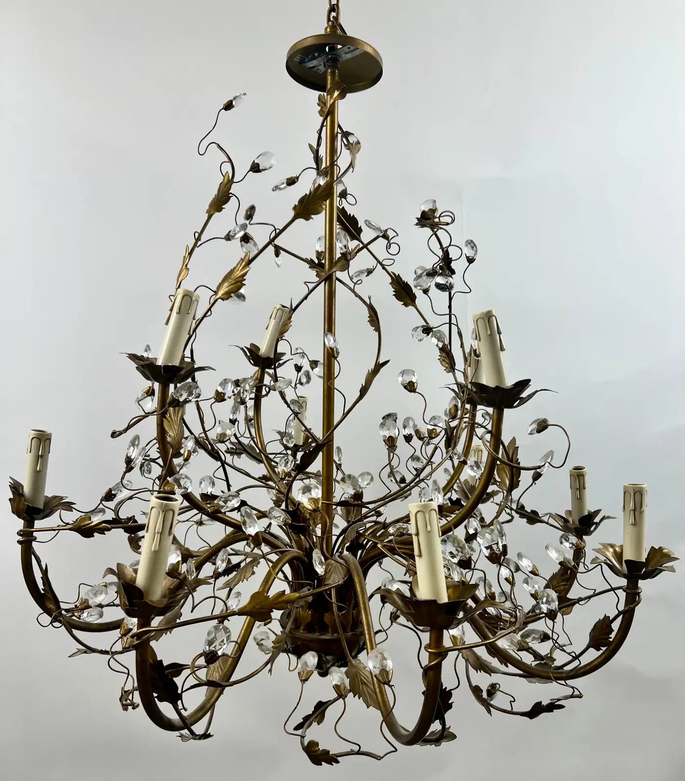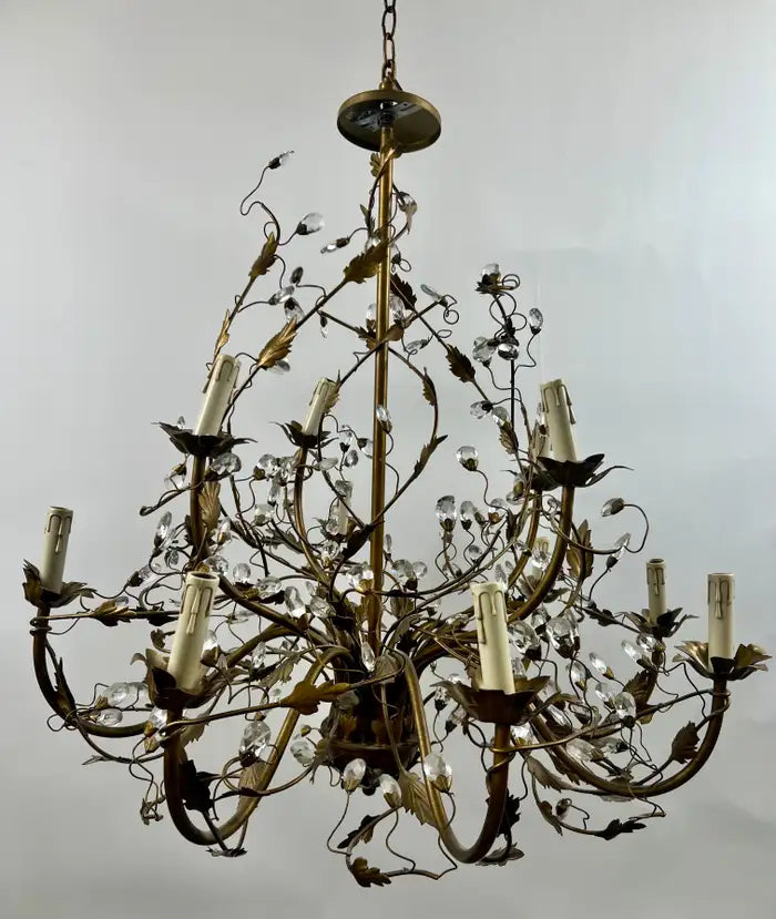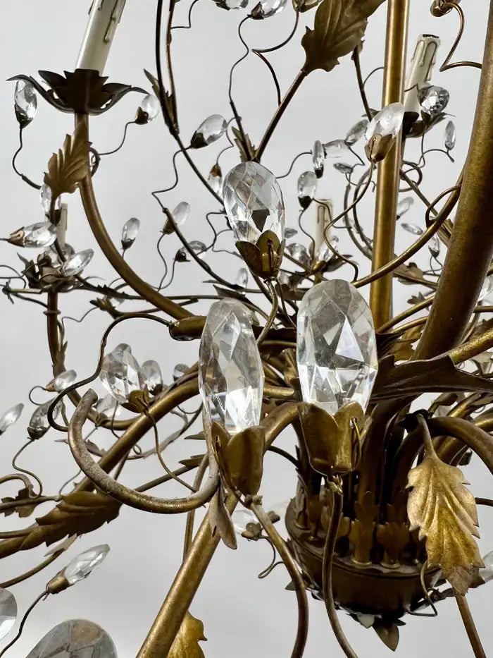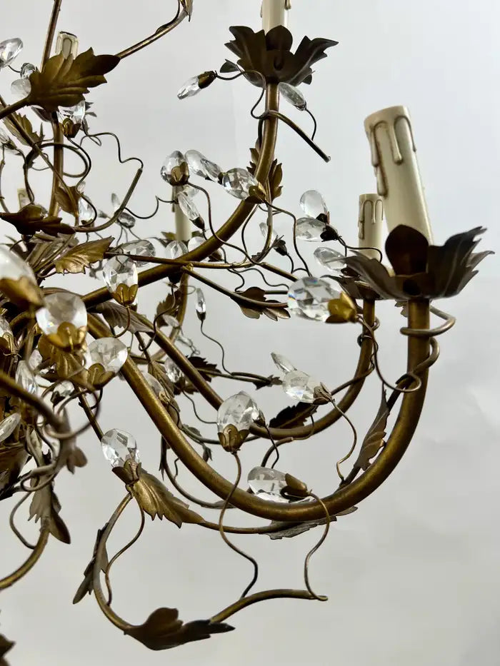 Maison Baguès Style French Foliate Chandelier in Bronzed Metal with Glass, 12-Light Candelabra: Inspired by the timeless elegance of Maison Baguès, this exquisite French chandelier embodies the poetic beauty of nature with its intricate foliate design. Hand-forged in bronzed metal, the frame is gracefully adorned with delicately scrolling vines and leaves, interspersed with faceted glass drops that glisten like dewdrops in morning light. The chandelier features twelve gracefully curved arms, each supporting a candelabra-style light, evoking the romantic charm of 19th-century French interiors.