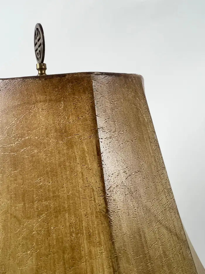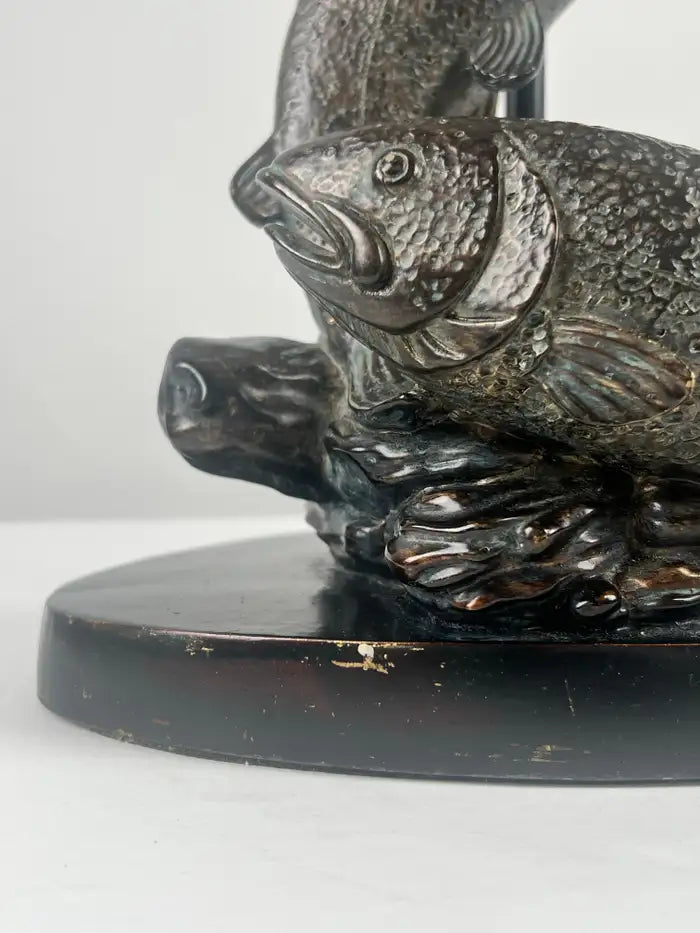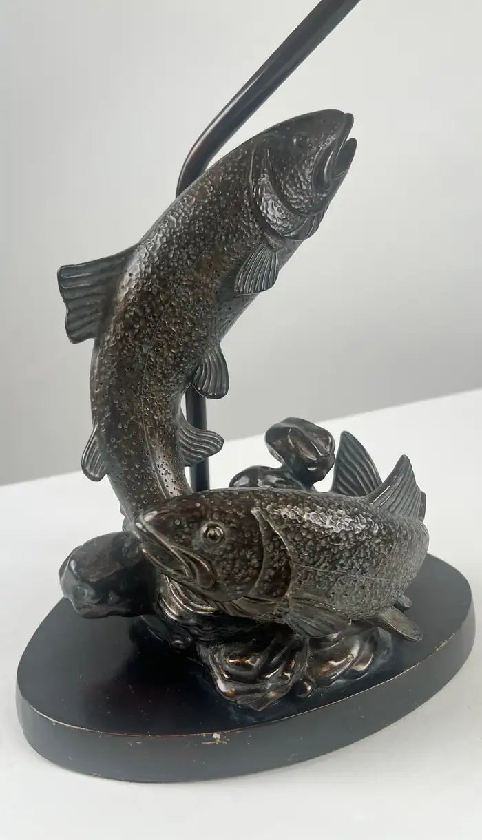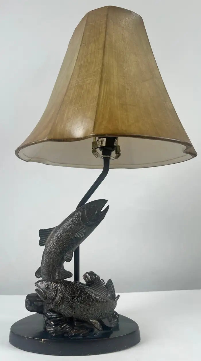 This rustic fishermen cabin table lamp features a sculptural base depicting a flying trout in dynamic motion, crafted from polyresin and metal with a rich bronze-tone finish. The detailed surface texture and dark patina convincingly evoke the look of cast bronze. The lamp is paired with its original faux leather shade, finished in a warm antique tone that complements the rustic character of the base. The tapered form of the shade provides a soft, ambient glow while reinforcing the lamp’s lodge-style appeal. Resting on a circular base, this lamp is well-balanced and ideal for use on a side table, console, or desk. Its nature-inspired design makes it especially suited for rustic, cabin, lodge, or traditional interiors.