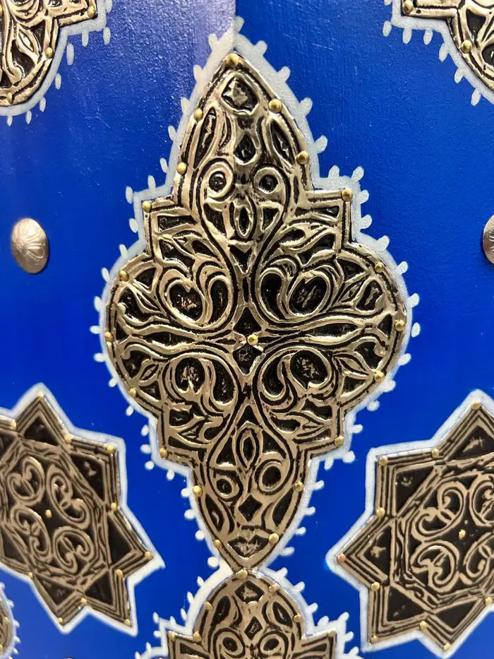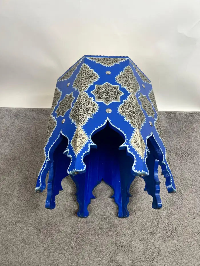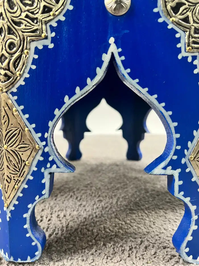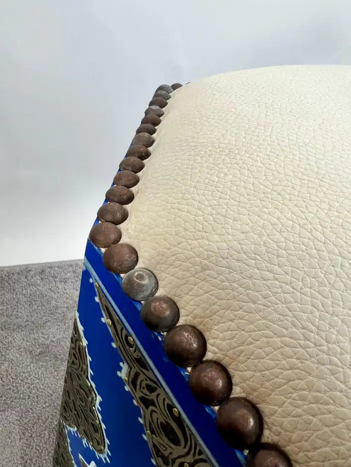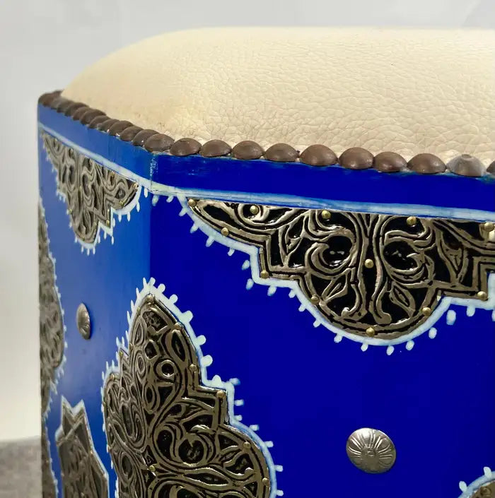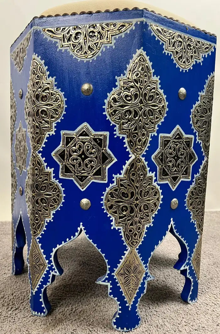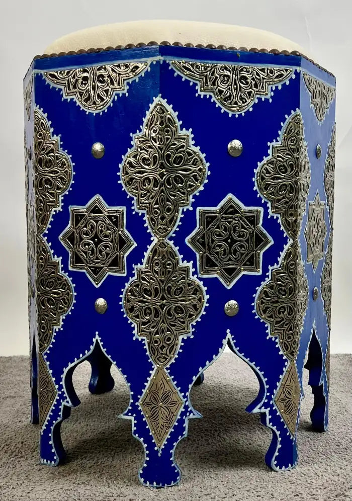 Boho Chic Moroccan Blue & Filigree Silver Design with White Leather Top Stool Infused with Moroccan artistry and Boho Chic flair, this striking stool is both functional and decorative. The hexagonal base is hand-finished in a rich cobalt blue, intricately adorned with ornate silver-toned filigree motifs that echo traditional Moorish patterns. Each panel is accented with nailhead details, adding depth and refinement to the design. Crowning the piece is a luxuriously upholstered white leather seat, offering both comfort and a crisp contrast to the vivid blue and silver palette. The arches design base adds a sculptural quality, enhancing its presence as a versatile accent piece. Perfect as a stool, side table, or decorative statement, this Moroccan treasure brings an eclectic elegance and worldly charm to interiors ranging from contemporary bohemian to globally inspired settings.