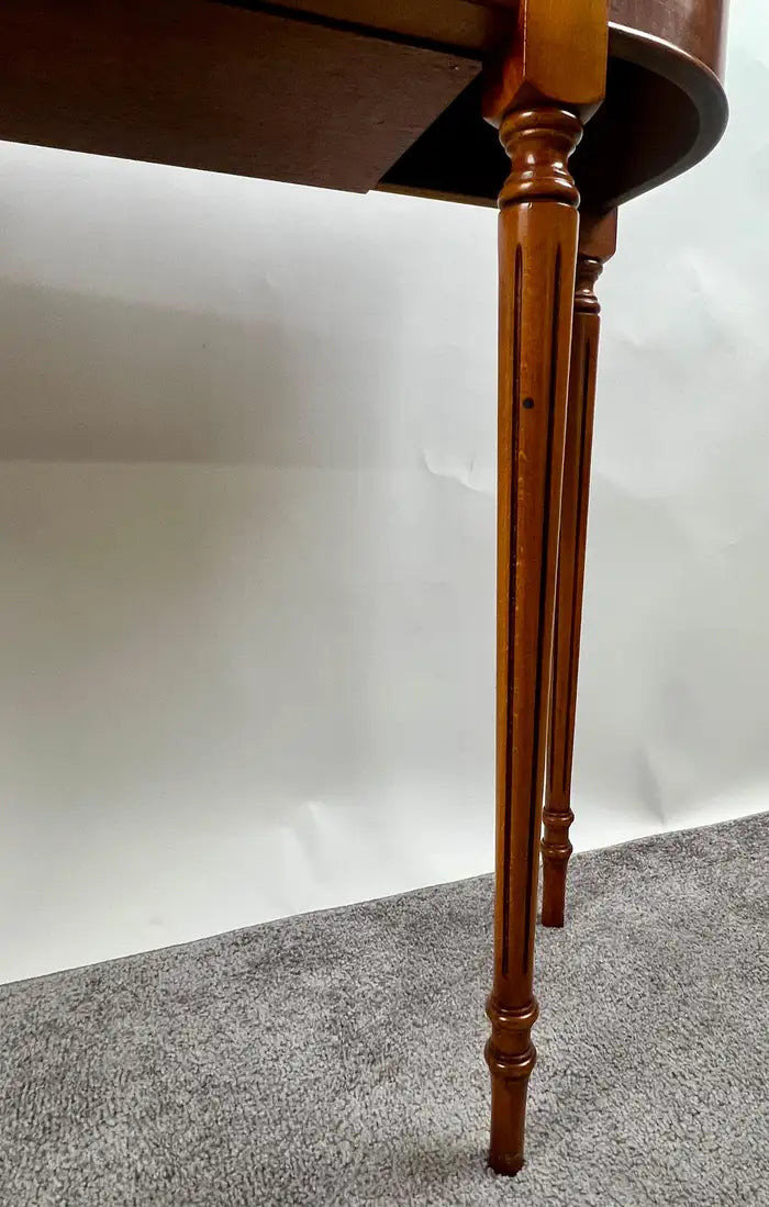 English Georgian Hepplewhite Style Two-Drawer Console Table Mahogany & Walnut : An elegant George III–inspired console table, finely crafted in mahogany with a beautiful walnut burl veneer top. The serpentine front is fitted with two drawers accented by original brass pull handles. The top is framed with delicate line inlay, enhancing the graceful form and rich surface character. Raised on slender, tapered, and fluted legs with turned details, the design reflects the refinement of the late 18th century while showcasing mid-20th century craftsmanship. With its warm tone, neoclassical silhouette, and timeless proportions, this console table makes a sophisticated statement in an entryway, dining room, or living space. A versatile piece that balances decorative elegance with practical use.
