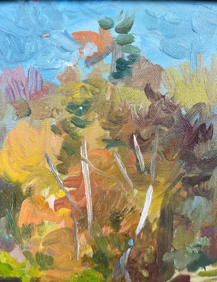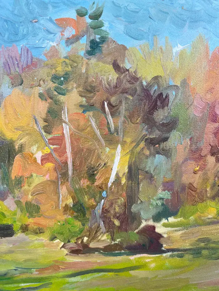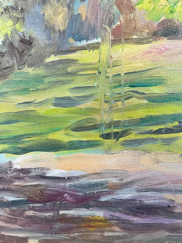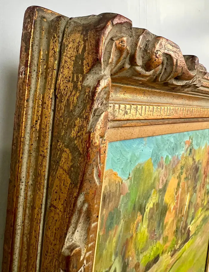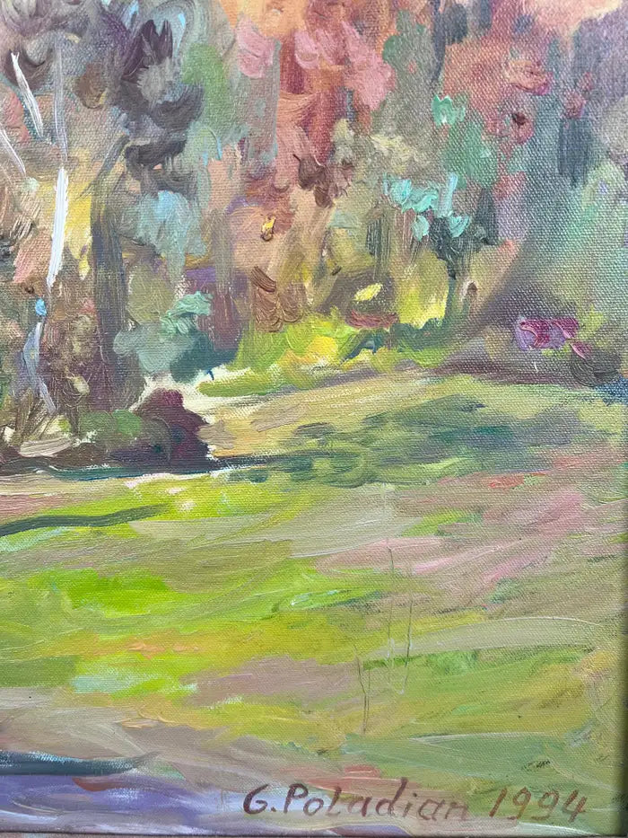 Oil on canvas landscape painting by Armenian-American artist Girair Poladian, signed and dated 1994 on the front lower right and further inscribed on the verso. Titled “Landscape” and measuring 20 x 16 inches (canvas size), the work captures a vibrant pastoral scene rendered in expressive brushstrokes and a richly layered palette. The composition features a sunlit foreground opening into a grove of autumnal trees, executed in warm golds, ochres, greens, and soft blues. Poladian’s painterly technique emphasizes movement and light, with energetic yet controlled brushwork that conveys depth and seasonal warmth. Presented in an ornate carved gilt wood frame that complements the tonal richness of the painting and enhances its traditional decorative appeal. The frame adds architectural presence, making the piece suitable for classic, transitional, or eclectic interiors. Signed and dated 1994 on the front; titled, dated, and inscribed on the verso. Ready to hang.
