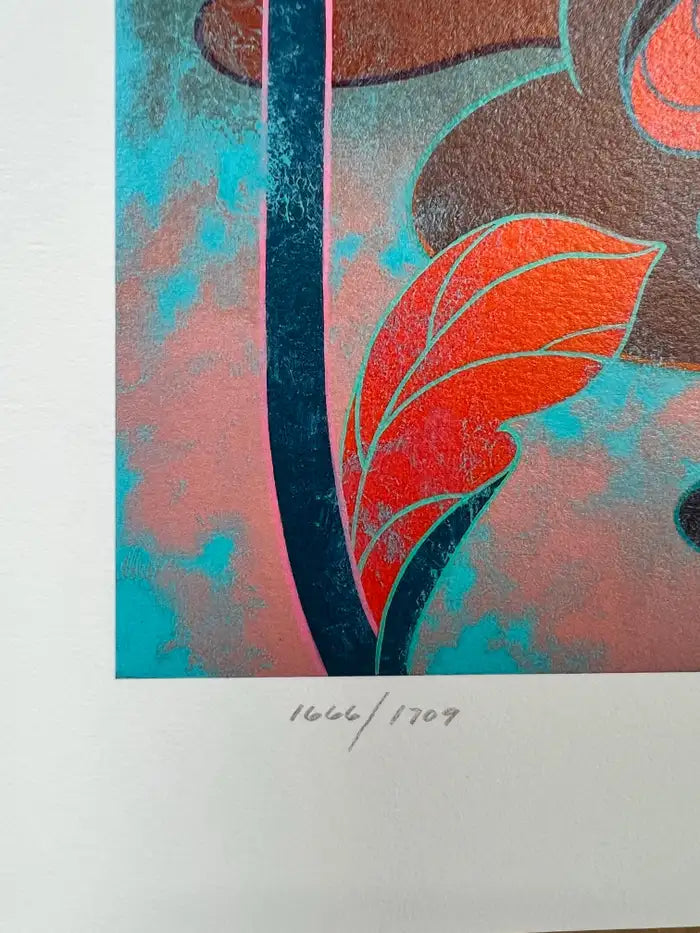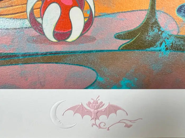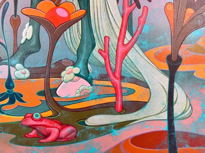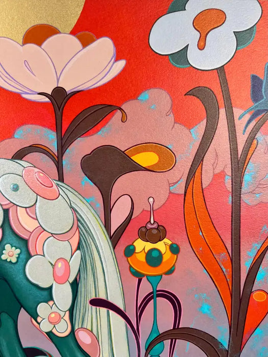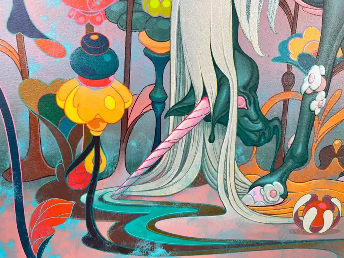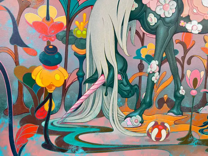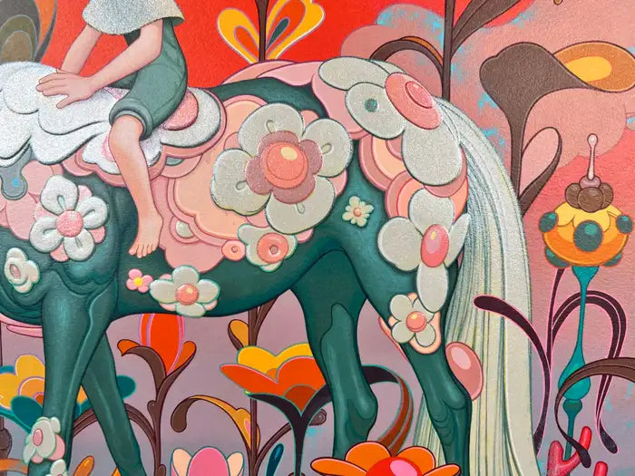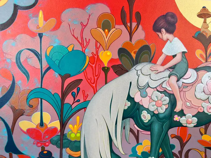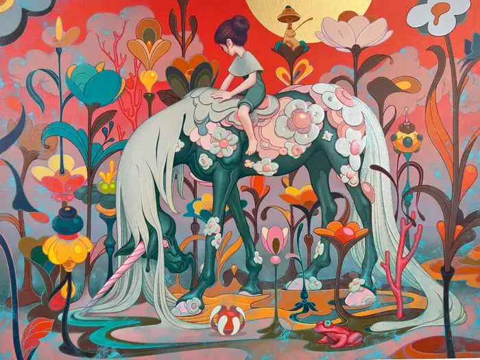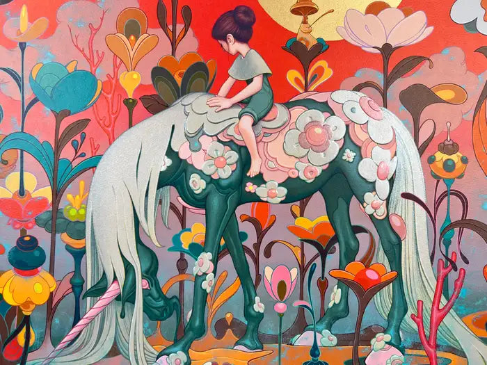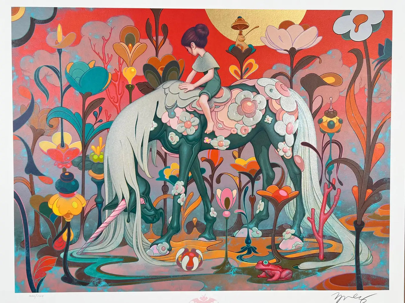 A mesmerizing work by acclaimed visual artist James Jean ( Taiwanese- American, b 1979), Traveler invites the viewer into a dreamlike realm where innocence, myth, and nature entwine. Rendered in Jean’s signature lyrical style, the composition centers on a child perched upon a unicorn-like creature adorned in lush floral motifs, each petal delicately embossed with iridescent detail. Surrounded by fantastical flora in vivid jewel tones, the scene evokes a surreal garden of rebirth and quiet wonder.