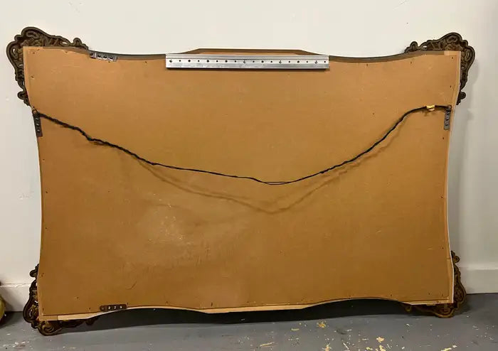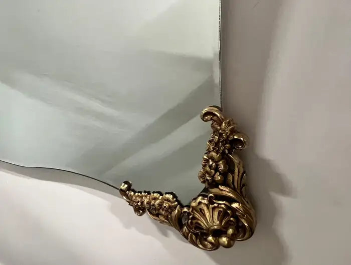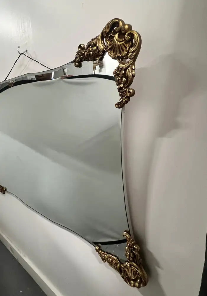 A striking and sculptural Mid-Century Baroque Revival wall mirror, distinguished by its gently undulating silhouette and richly ornamented gilt corners. Each corner is adorned with exquisitely cast rocaille motifs—floral scrolls, volutes, and cabochon details—evoking the opulence of 18th-century Italian and French decorative arts while retaining the sleek minimalism of 1950s modern design. The mirror’s subtly concave and convex edges create a soft, wavy contour that reflects light with elegance, adding depth, movement, and visual poetry to any space. Suspended by a fine top wire, this piece blends Old-World ornamentation with Mid-Century chic, making it ideal for entryways, salons, or layered gallery walls. A refined and highly decorative accent, perfect for collectors and interiors seeking a sophisticated fusion of vintage glamour and timeless European craftsmanship.