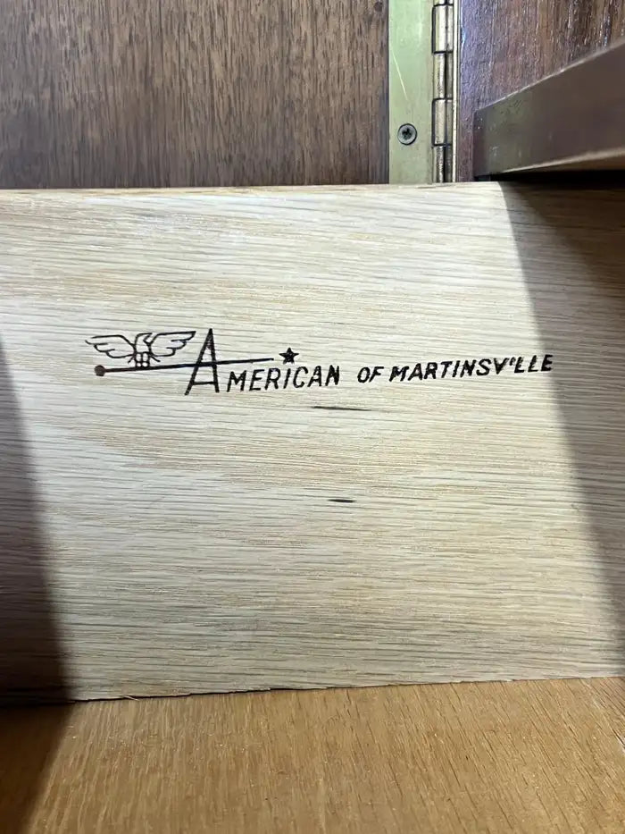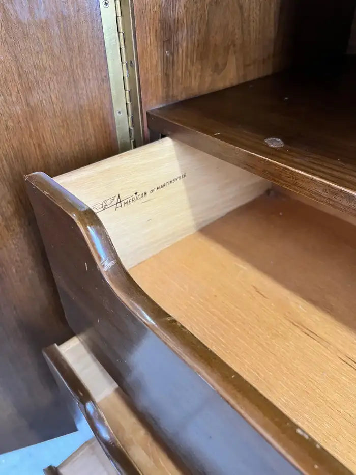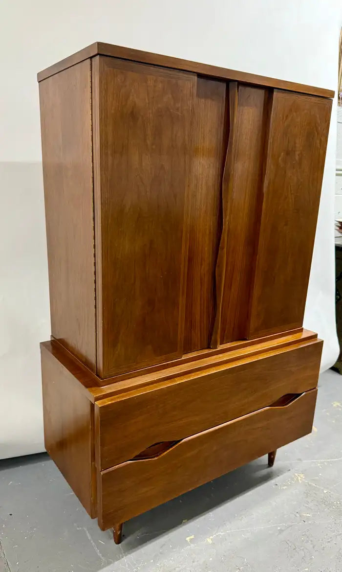 Mid-Century Modern American of Martinsville Walnut High Boy Dresser or Armoire This Mid-Century Modern walnut armoire by American of Martinsville is a beautifully executed example of American design that balances clean architectural lines with exceptional functionality. Crafted in richly grained walnut, the piece showcases a warm, refined finish that highlights the natural beauty of the wood. The armoire features two large paneled doors that open to reveal a thoughtfully organized interior with divided storage compartments and three interior drawers, ideal for clothing, linens, or accessories. Below, two generously sized exterior drawers provide additional concealed storage, seamlessly integrated into the overall design. Subtle sculpted wooden pulls and tapered modern legs add to the piece’s understated elegance while maintaining a sleek, streamlined profile. Condition : The walnut surface shows scratches to the surface consistent with age and normal use. some fading to the surface color - A couple of the drawers ( Bottom ones ) exhibit some stiffness when opening and closing. Overall, the piece remains solid, structurally sound, and presents beautifully.