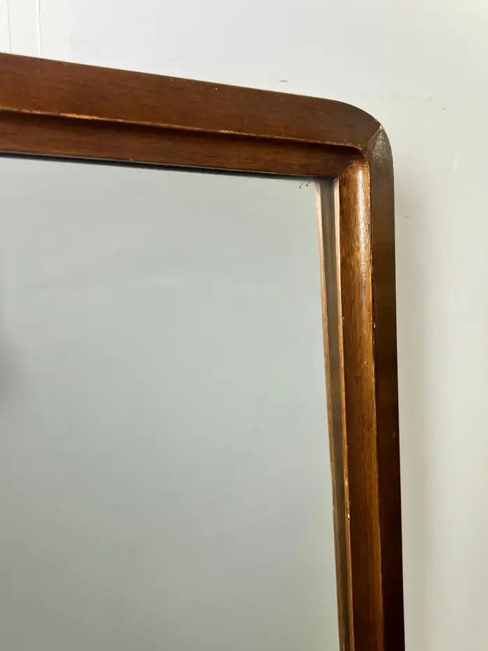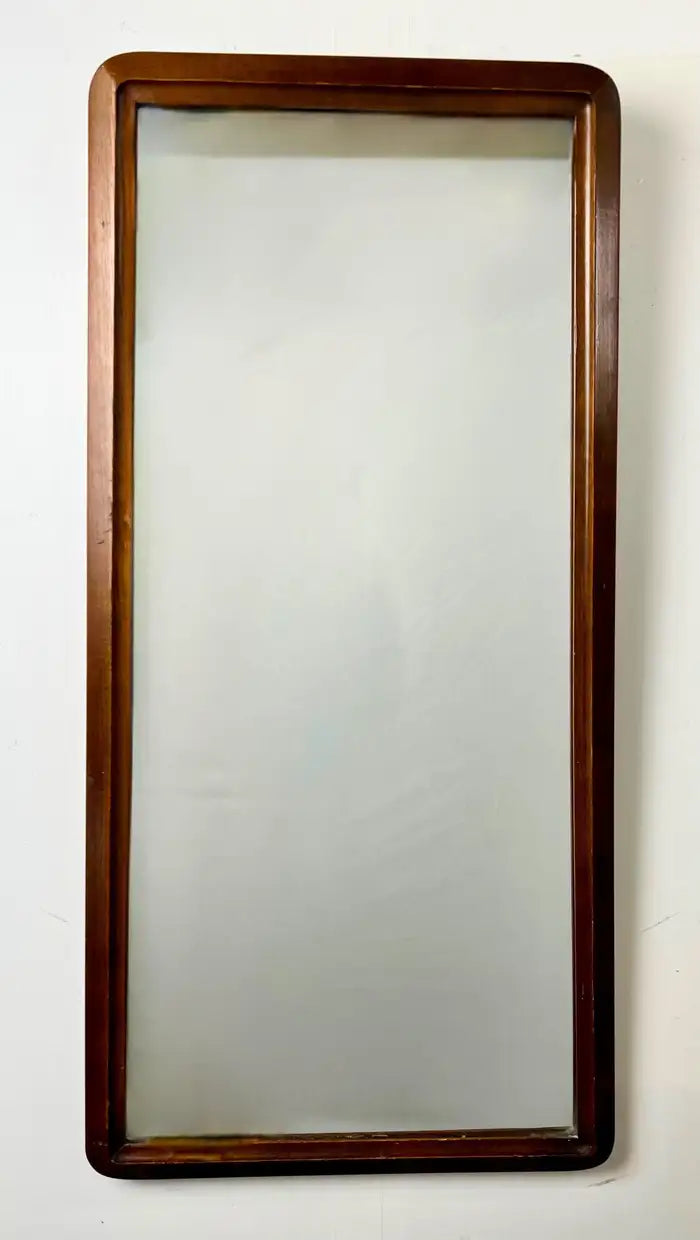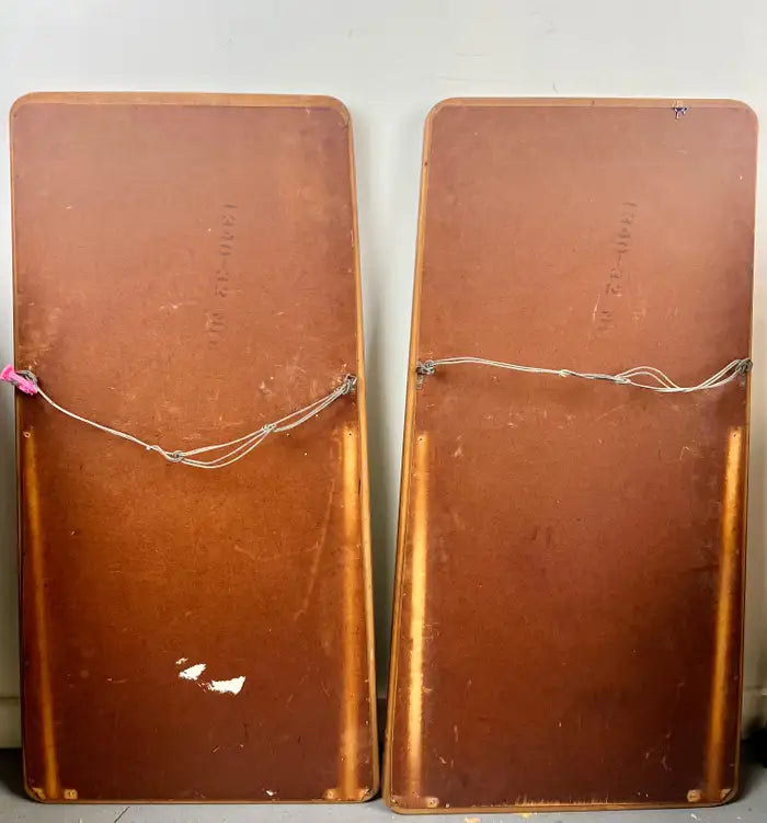 A quality pair of Mid-Century Modern walnut mirrors by the iconic American furniture maker American of Martinsville, celebrated for their refined craftsmanship and timeless modernist design. These tall rectangular mirrors feature beautifully warm solid walnut frames with gently tapered edges and clean architectural lines—hallmarks of the brand’s classic mid-century aesthetic. The rich wood grain adds depth and character, while the slender proportions make them ideal for creating vertical emphasis in a room. the pair of mirrors can be styled side-by-side as a dramatic statement wall flanking a console, credenza, or bed, as coordinating mirrors in a bedroom or dressing area or In a hallway or entryway to enhance light and scale. Details: Maker: American of Martinsville Origin: United States Era: Mid-Century Modern, circa 1950s–1960s Material: Solid walnut frames with original mirror glass Style: Mid-Century Modern