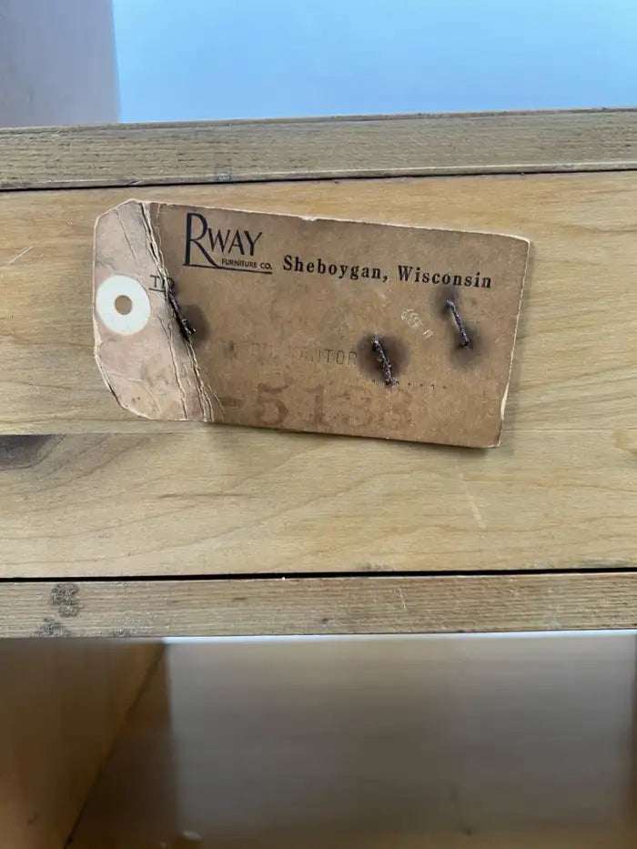 R-Way Furniture Company Period: Mid-20th Century Material: Birdseye maple veneer over wood Features: One drawer, open shelving, gallery top, tapered legs Condition: Good vintage condition with minor veneer chips and light wear consistent with age and use, primarily along the lower shelf edges as shown in the listing photos. some scratches to the wood surface. Structurally sound and presents well.