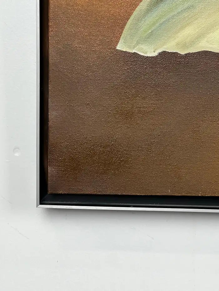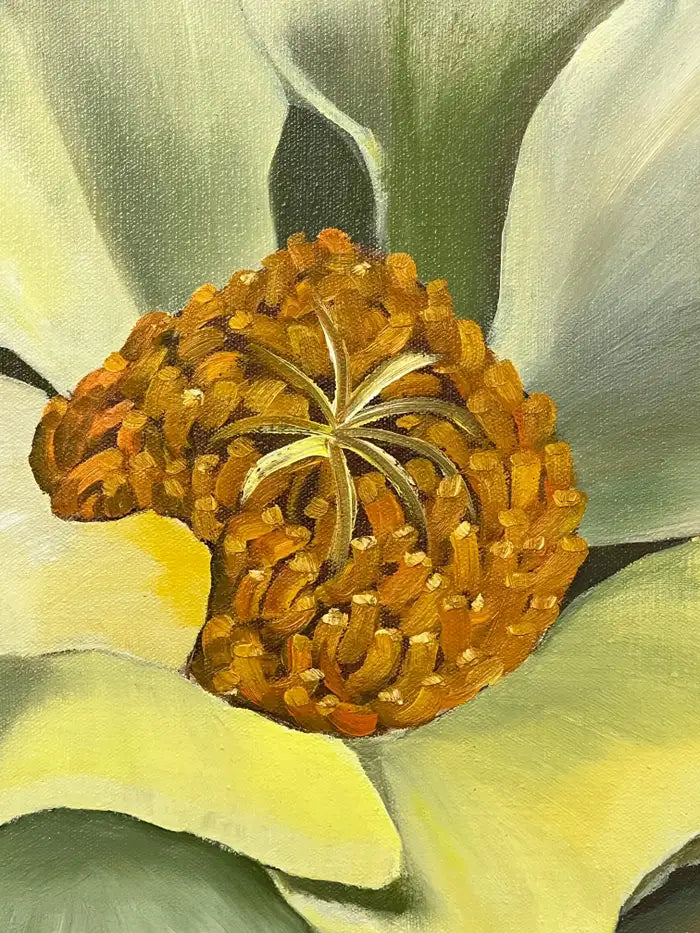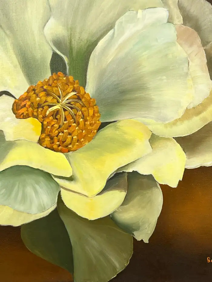 This decorative painting features a luminous white flower rendered at dramatic scale, its softly layered petals unfolding around a richly textured golden center. Set against a warm, atmospheric background of deep browns and subtle tonal gradations, the composition emphasizes depth, serenity, and visual balance. The artist " Bisnoff " employs smooth transitions of color and gentle shading to create a sense of realism while maintaining a refined, contemporary aesthetic. The oversized bloom becomes both subject and statement—elegant, calming, and timeless—making the work particularly well suited for sophisticated interiors, hospitality spaces, or modern residential settings. Signed “Bisnoff” in the lower corner, the painting exemplifies late 20th-century decorative floral art, where craftsmanship and visual impact take precedence. Presented in a clean frame, the piece offers strong wall presence and functions beautifully as a focal point above a console, sofa, or bed.