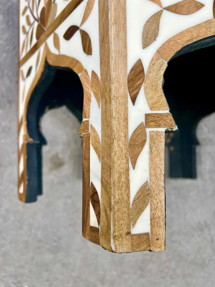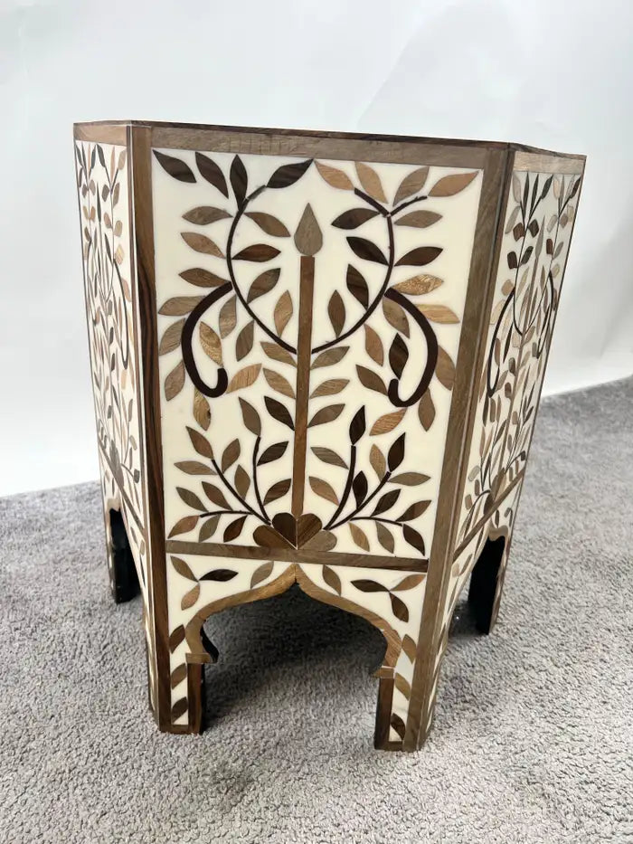 Handmade Moroccan Boho-Chic Walnut and Resin Inlay Hexagonal Side Table This exquisite handcrafted Moroccan side table captures the spirit of Boho-chic artistry through its intricate craftsmanship and natural elegance. Made of solid walnut wood and delicately inlaid with creamy resin, the table features a hexagonal silhouette adorned with hand-carved floral and vine motifs. The geometric form and ornate patterns draw inspiration from traditional Moroccan design while blending seamlessly with contemporary interiors. Perfect as a side or end table, it adds warmth, texture, and artisanal charm to any living space—whether placed beside a sofa, armchair, or as a stand-alone accent piece. Style: Moroccan / Boho Chic Material: Walnut wood and resin inlay Shape: Hexagonal Origin: Morocco Period: Contemporary Condition: Good wear confident with age and use, handcrafted finish