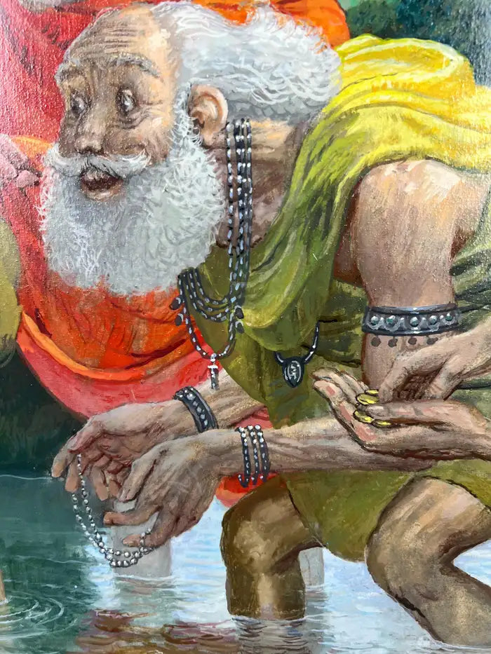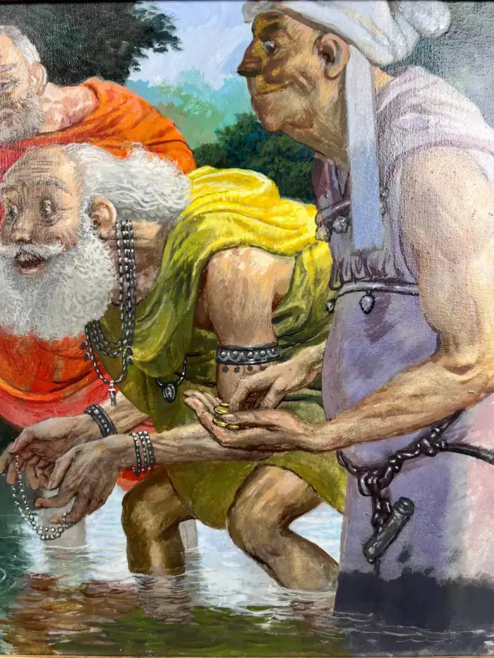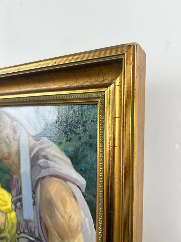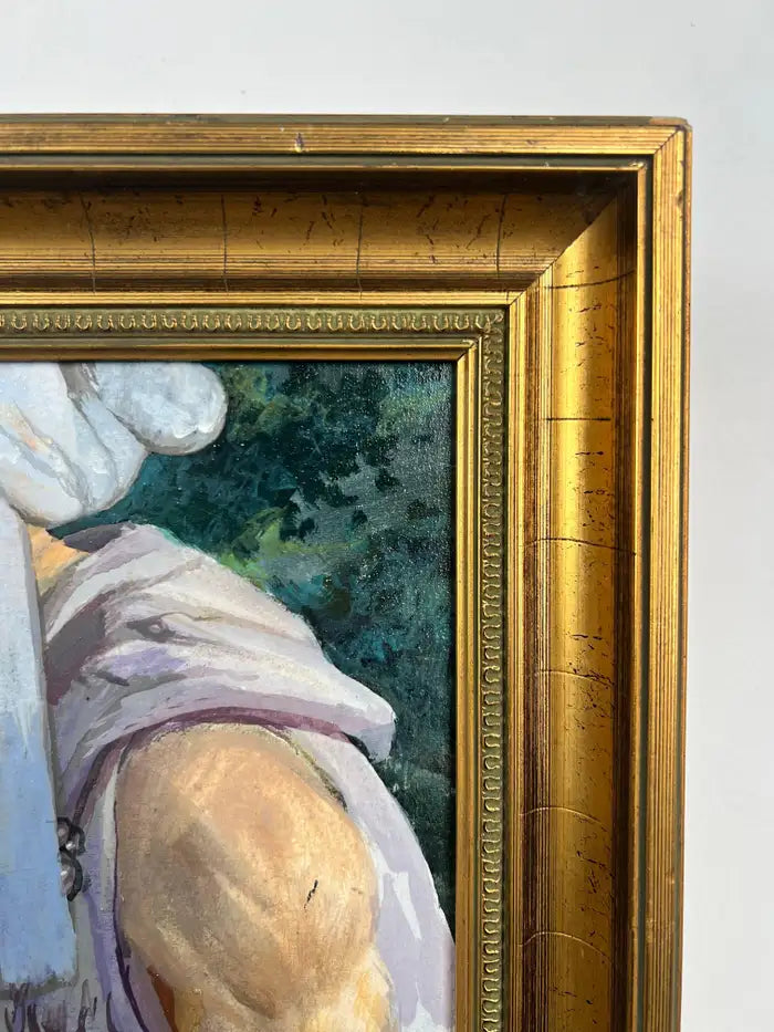 A dramatic and highly detailed figurative oil painting depicting a narrative scene of a nude female figure standing in shallow water, observed by three elderly male figures gathered at the water’s edge. The composition evokes themes often associated with mythological, allegorical, or classical storytelling traditions. Executed in oil on canvas, the work demonstrates strong academic influence with careful attention to anatomy, facial expression, and gesture. The figures are rendered with expressive realism, while the water and surrounding landscape provide atmospheric depth. The emotional tension within the scene — conveyed through posture, gaze, and interaction — gives the painting theatrical presence. Rich color contrasts, particularly the warm reds and yellows against the cool tones of the water and sky, add visual intensity. Presented in a gilt frame that enhances the traditional character of the work. Artist unknown. A compelling statement piece suitable for collectors of narrative, classical, or symbolist-inspired art.