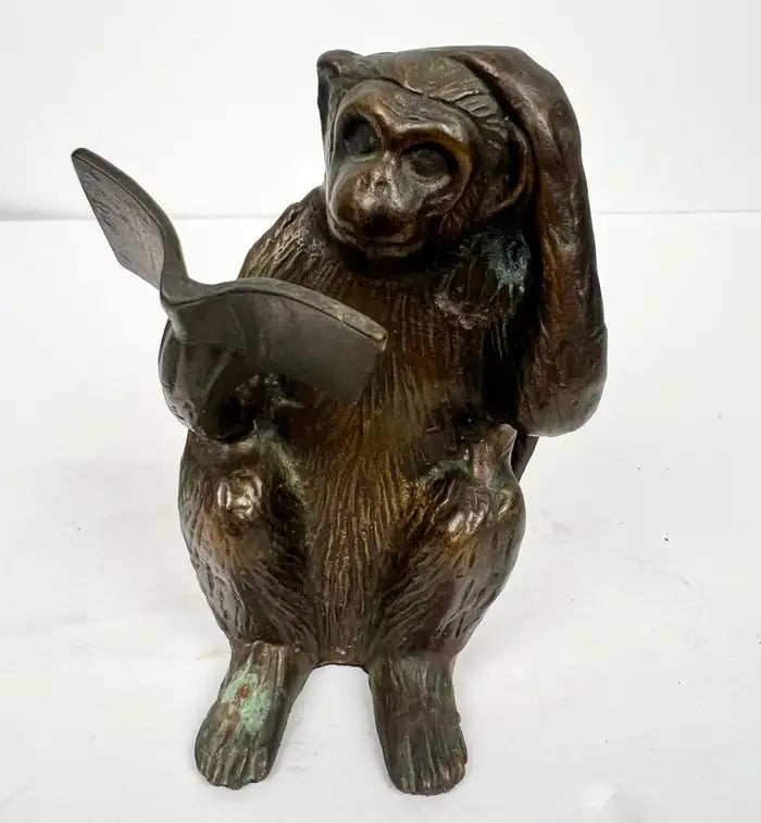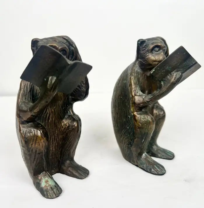 Pair of Vintage Brass Monkeys Reading Books Figurines / Paperweights This charming pair of vintage brass figurines depicts monkeys deeply engrossed in reading books, a whimsical motif that beautifully blends playfulness with intellectual symbolism. Each figure is finely cast, showcasing detailed fur texture and expressive features, while the warm brass finish has developed a rich patina over time, enhancing their vintage character. Sturdy and weighty, these versatile pieces can serve as decorative figurines, bookends, or functional paperweights, bringing a touch of humor and sophistication to a desk, library, or display shelf. Collectible and full of personality, they are perfect for lovers of vintage décor, animal motifs, or unique conversation pieces.