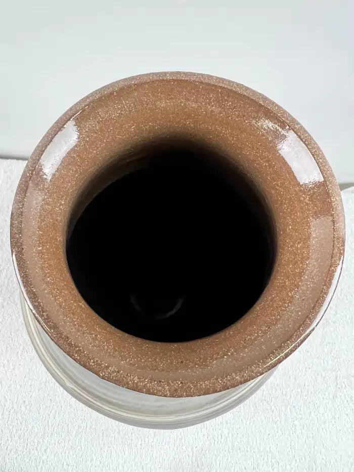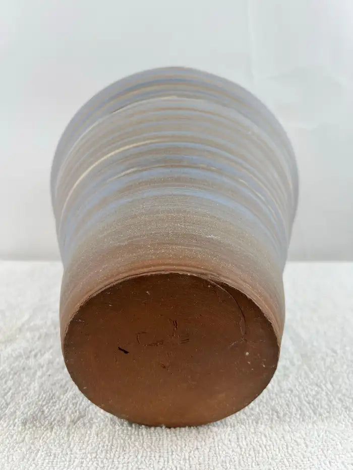 The fluid movement of the glaze creates a rhythmic, organic pattern—each band subtly shifting in tone and thickness—ensuring that no two pieces are ever alike. The satin finish and earthy palette reflect the core values of the Arts & Crafts / Mission movement, emphasizing craftsmanship, natural materials, and understated beauty.