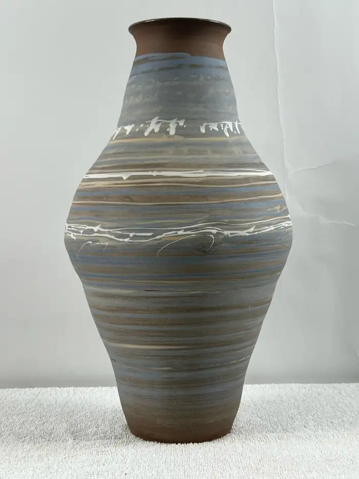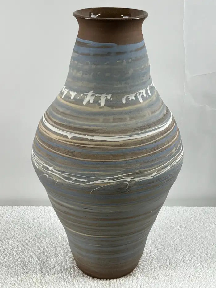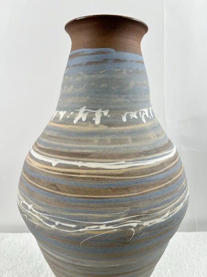 Vintage Handmade Pottery Vase with Blue & Earth-Tone Swirl Glaze
