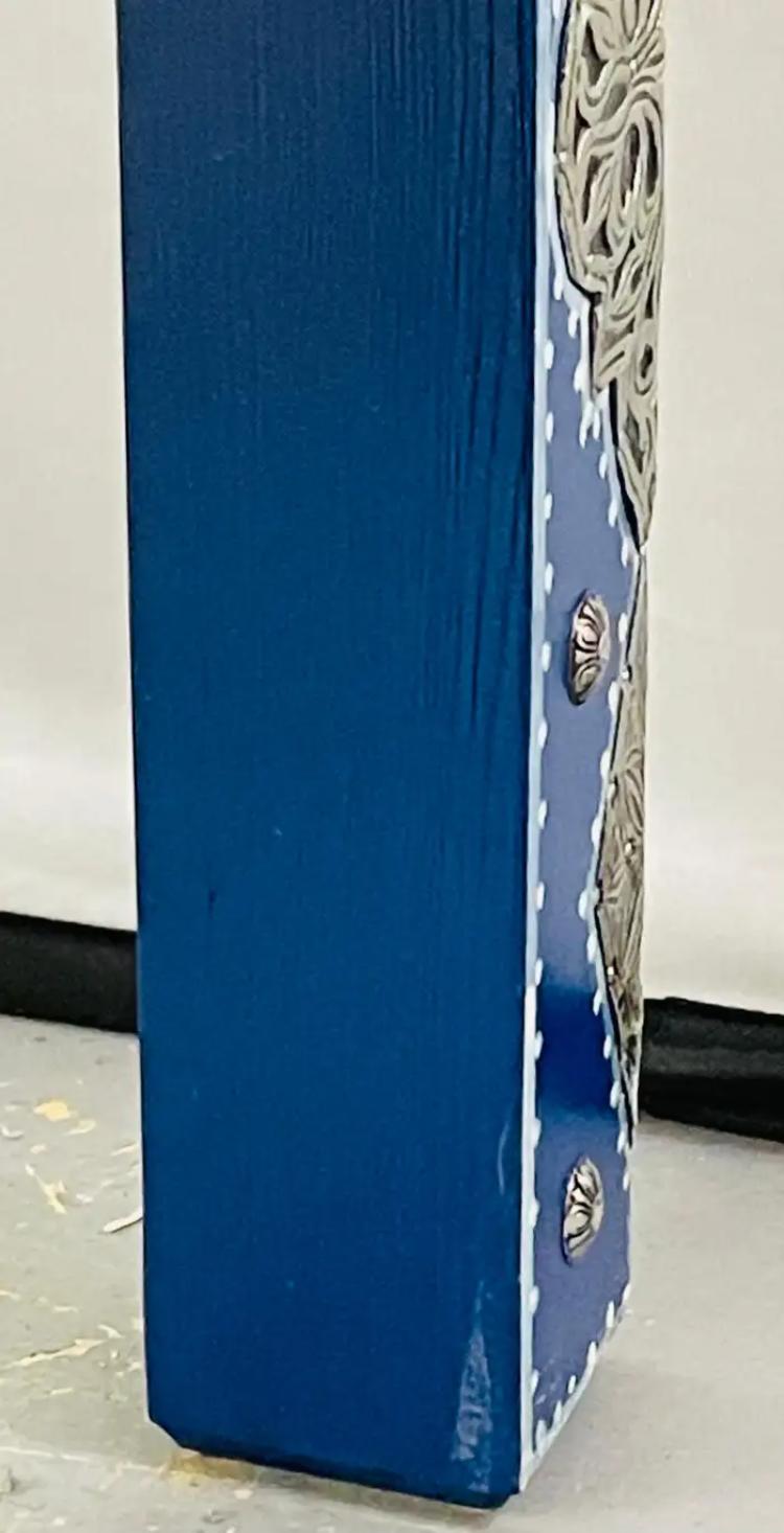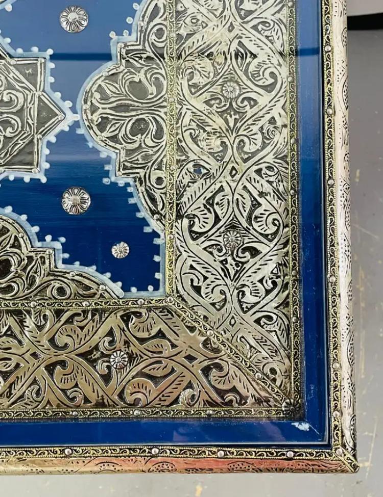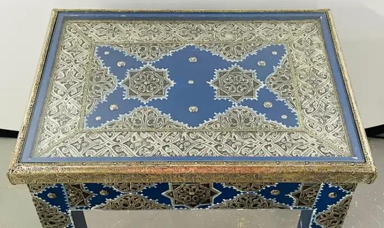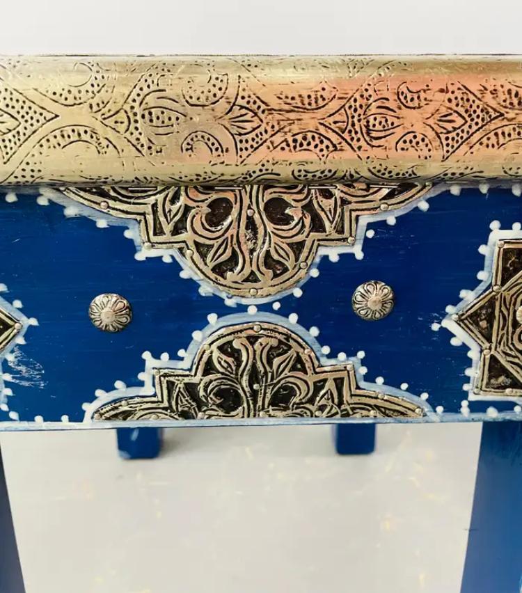 This striking pair of Moroccan side tables showcases bold color and intricate craftsmanship, blending traditional Moorish motifs with a relaxed Boho Chic aesthetic. Each rectangular table is hand-finished in a rich cobalt blue, beautifully contrasted by ornate silver-toned metal detailing featuring geometric star patterns and decorative nailhead accents. The tabletops echo the same geometric motifs, framed with silver trim for a cohesive, artisan look. Substantial in presence yet versatile in scale, these tables work equally well as side tables, end tables, or accent tables, adding texture and global character to a living room, bedroom, or eclectic interior. Decorative yet functional, this pair brings warmth, craftsmanship, and a collected, worldly feel—perfect for interiors that embrace color, pattern, and artisanal design