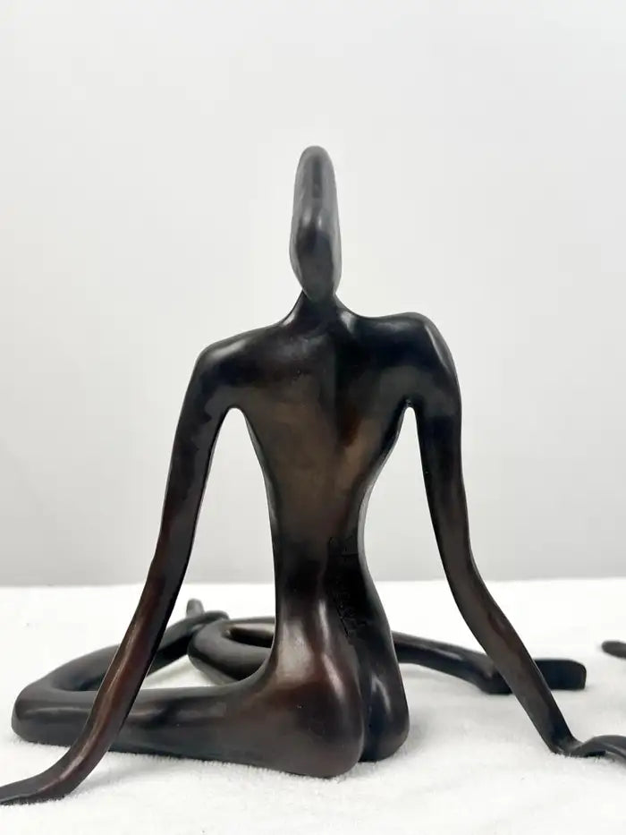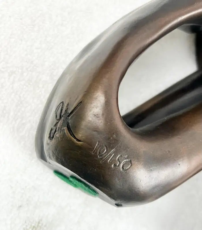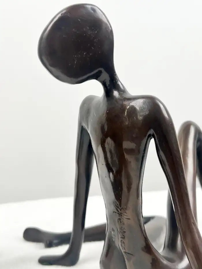 A refined set of three limited-edition bronze sculptures depicting elongated seated female figures, each signed by the artist and individually numbered. Executed in a modernist style, the figures are defined by fluid lines, balanced proportions, and a quiet sense of movement, evoking the influence of mid-century European sculpture. Each piece features a rich, dark patina that enhances the smooth contours and minimalist treatment of form. While unified as a cohesive group, the figures present subtle variations in pose, creating a dynamic and harmonious composition when displayed together. The sculptures are signed with a stylized monogram, read “Kennedy” and bear varying edition numbers, adding to their individuality within the series. An elegant decorative statement, ideal for interior designers and collectors seeking sculptural objects with strong visual presence and timeless appeal.